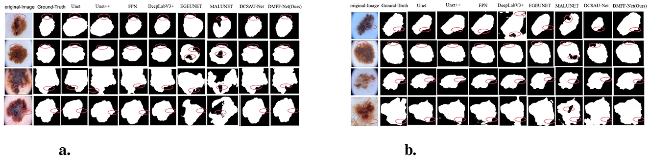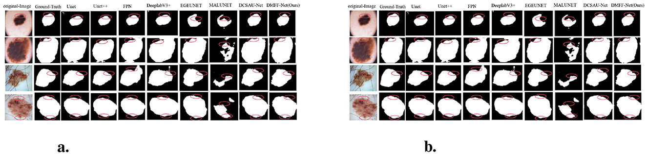 Moreover, Figure 6b shows a visual comparison of a number of common atypical skin lesions. Unlike other models, DMFF-Net integrates mid-level and high-level feature fusion with a mechanism that generates attention maps using global information in the spatial dimension. This mechanism effectively assigns weights and enhances feature representation. What's more, DMFF-Net aggregates both global and local information while controlling the receptive field for feature extraction. These characteristics enable the model to handle finer details, particularly in segmenting blurred edges, allowing for cleaner and more distinct extraction of edge features. Notably, DMFF-Net outperformed other SOTA models in segmenting lesion areas. Overall, the segmentation results of DMFF-Net are more aligned with the original annotated images, demonstrating superior expressiveness and robustness.