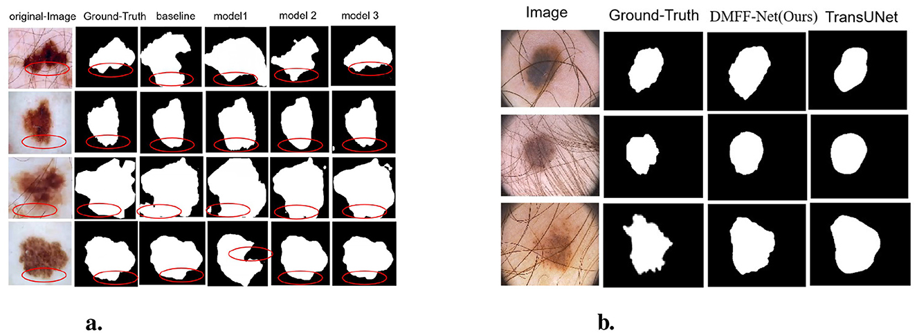 Figure 9. (a) Visualization comparison of ablation experiments on the ISIC 2017 dataset. (b) Qualitative comparison between DMFF-Net and TransUNet on PH2 images with severe artifacts.