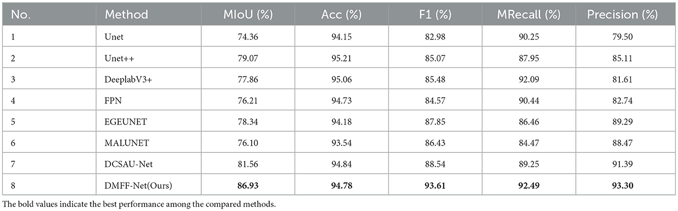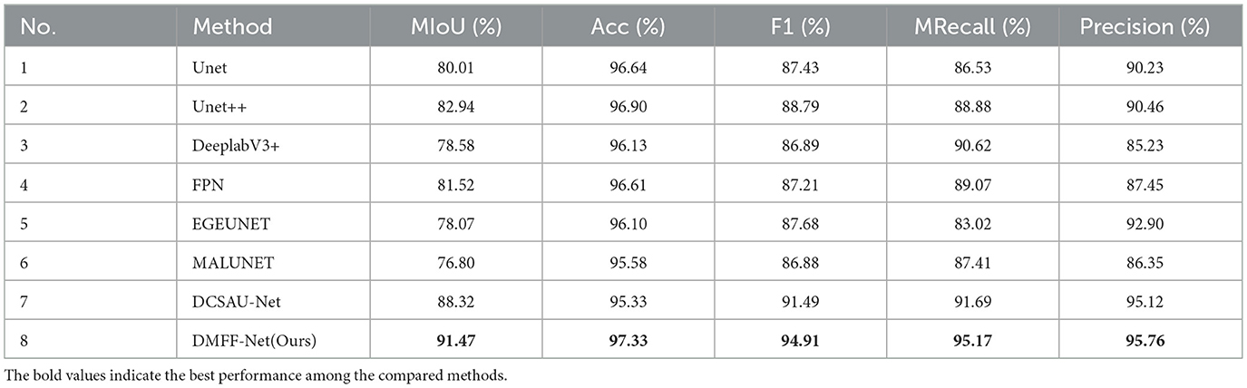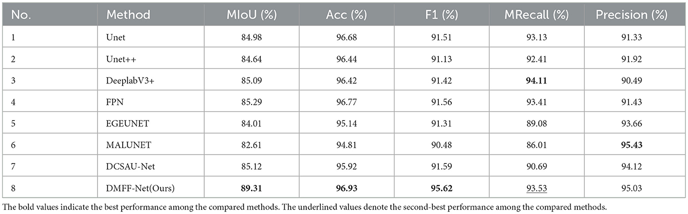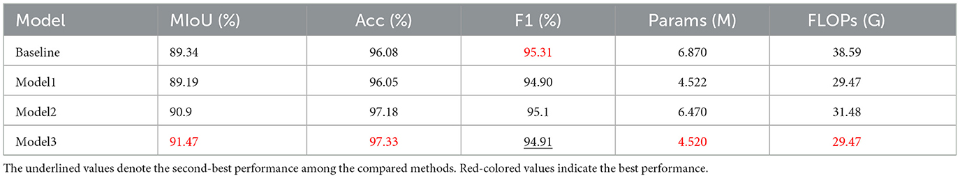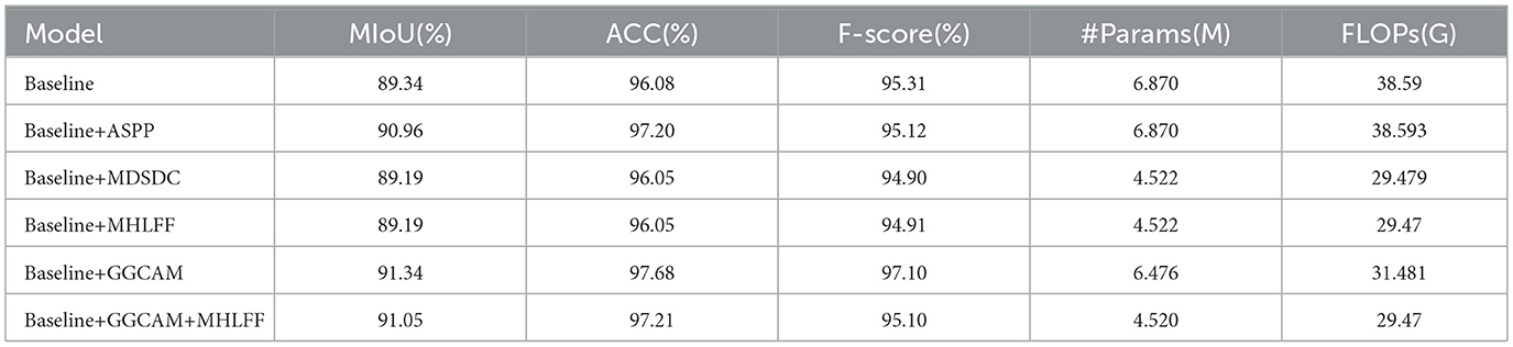 Table 4. Comparison of ablation experiments for the main module in the DMFF-Net, where Params is the number of parameters and FLOPs is Floating Point Operations. Mark the best result in red font and the Baseline is DeepLabV3.