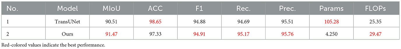 Where TP, TN, FP, and FN represent true positives, true negatives, false positives, and false negatives, respectively. The values of all evaluation metrics range from 0 to 1, with values closer to 1 indicating better segmentation performance and values further from 1 indicating poorer performance.