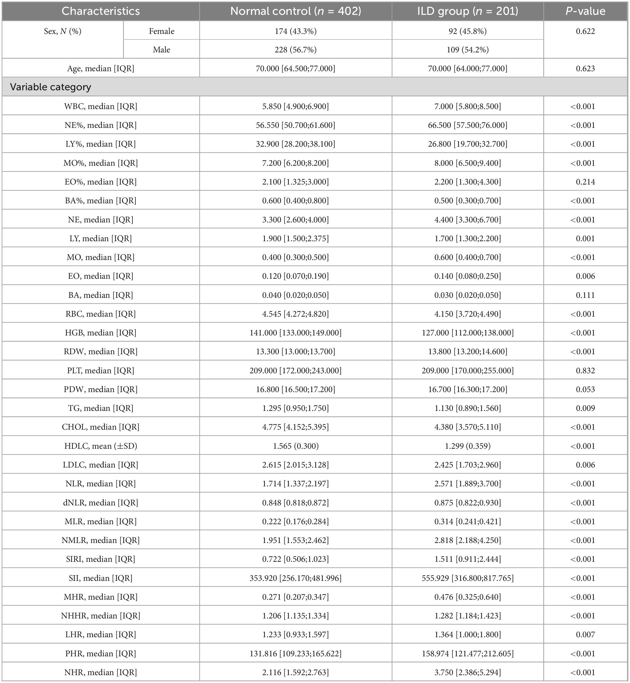 Currently, ILD diagnosis primarily relies on high-resolution computed tomography (HRCT) and pulmonary function tests, but these methods have limitations including radiation exposure, high costs, and operational complexity. Blood biomarkers (including KL-6, -D and MMPs) (2–4) are increasingly used because they’re non-invasive, convenient, and reproducible. Research shows that both systemic inflammation and immune dysregulation contribute significantly to ILD development, driving interest in related blood biomarkers (5, 6). However, most existing studies concentrate on single or limited combinations of biomarkers, lacking comprehensive analysis and integration of multidimensional blood parameters, which hinders a complete reflection of ILD’s complex pathophysiology.