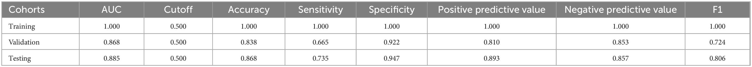 As shown in Figures 5A–C and Table 3, the AUC values of the test cohort were comparable to those of the validation cohort. Figure 5D shows comparable performance between validation and training cohorts, demonstrating the model’s appropriate fit without overfitting. As shown in Table 3, the model achieved >70% accuracy, sensitivity, and specificity in the test cohort.