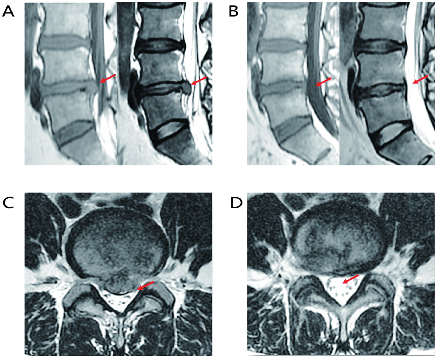 Representative MRI images of LIVD reabsorption. (A) Sagittal MRI image of LIVD before treatment. (B) Sagittal MRI image after LIVD reabsorption. (C) Axial MRI image of LIVD before treatment. (D) Axial MRI image after LIVD reabsorption.