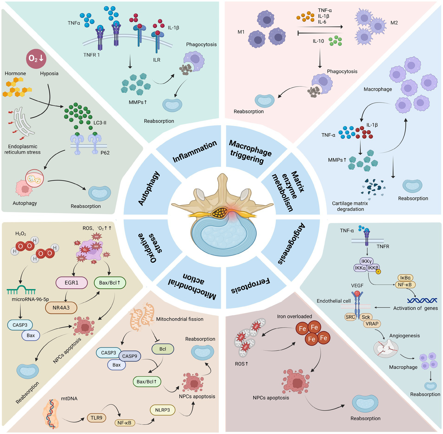 Inflammatory factors such as TNF-α and IL-1β activate the secretion of chemokines by IVD cells, which induces the activation of MMPs and stimulates neointima formation, and the secretion of cytokines to promote LDH reabsorption. | |