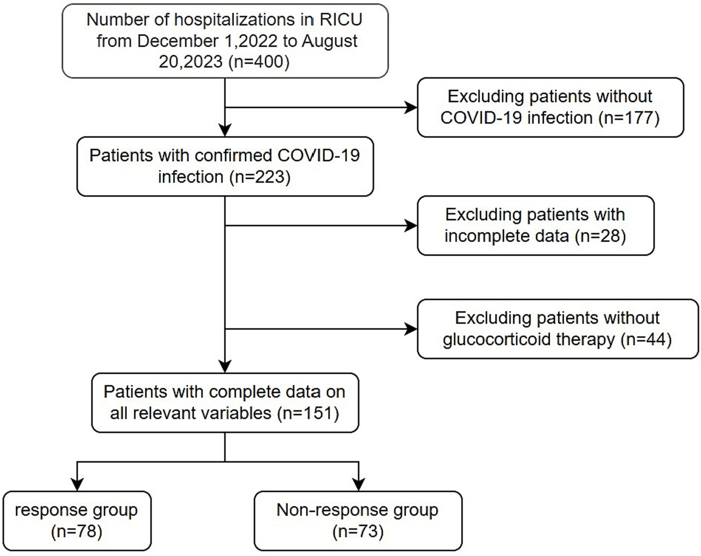 The World Health Organization (WHO) declared COVID-19 a global public health emergency on January 30, 2020 (1). Following China’s lifting of epidemic control measures on December 7, 2022, a surge in severe COVID-19 cases was observed, with mortality rates escalating despite intensive care (2). This resurgence highlighted critical gaps in predicting treatment outcomes, particularly for immunomodulatory therapies like glucocorticoids.