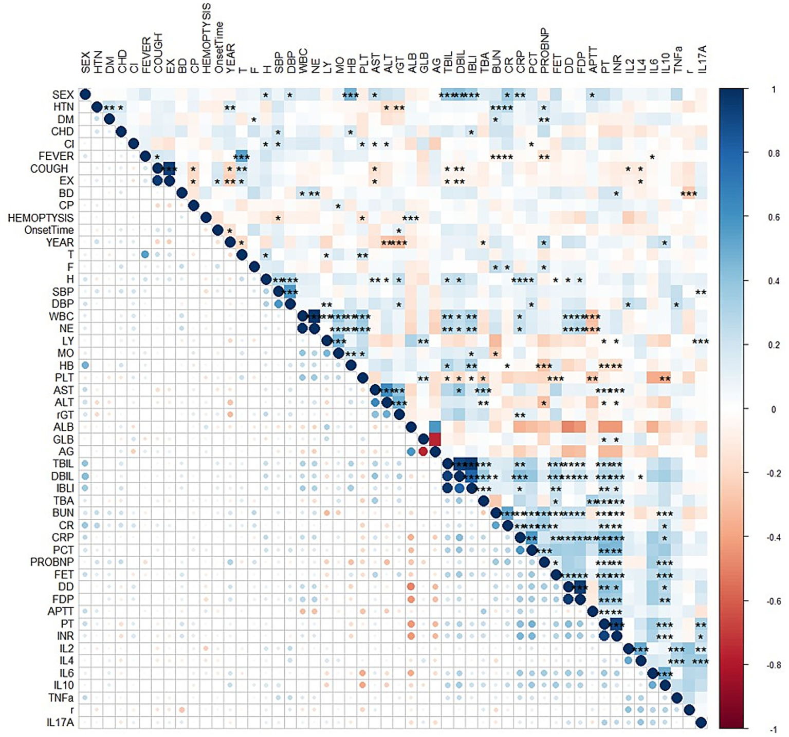 Correlation analysis between variables represented by a heatmap. HTN = high blood pressure, DM = Diabetes, CHD=Cardiovascular disease, CI=Cerebral infarction, EX = Expectoration, BD=Dyspnea, CP=Chest Pain, T = Temperature, F = Respiratory rate, H=Pulse, SBP = systolic blood pressure, DBP = diastolic blood pressure, WBC = white blood cell, NE = Neutrophils, LY = lymphocytes, MO = monocytes, HB = hemoglobin, PLT = platelets, AG = albumin/globulin, TBA = total bile acid, BUN = urea nitrogen, CR = creatinine, CRP=C-reactive protein, PCT = procalcitonin, FER = ferritin, r = IFN-γ.