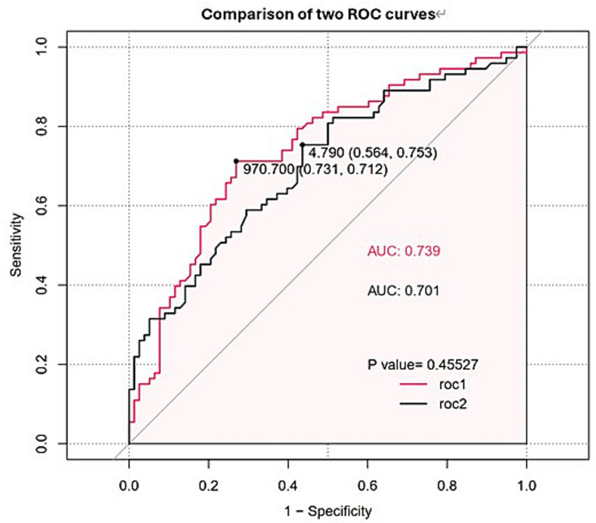 ROC curves and AUC values of FET and IL-10. The red line (ROC1) represents FET, while the black line (ROC2) represents IL-10.