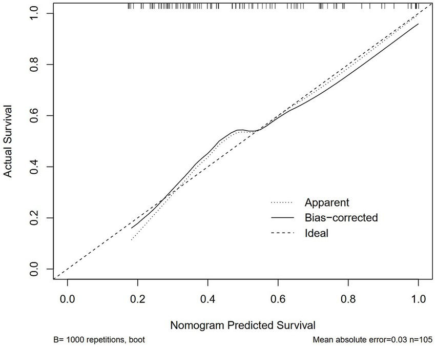 The prediction model was developed in two steps (16). First, univariate logistic regression was used to screen variables with p < 0.05 while plotting the ROC curve and calculating the AUC for each variable. Multicollinearity was evaluated using Spearman’s correlation heatmap and variance inflation factor (VIF). The heatmap highlighted strong pairwise correlations. VIF analysis revealed severe multicollinearity in each variable. This combined approach balanced visual correlation analysis with robust VIF quantification. Least absolute shrinkage and selection operator (LASSO) regression was performed to analyse variations in mean squared error and variable coefficients based on λ values, effectively mitigating collinearity and overfitting. In LASSO regression, λ.min was defined as the λ value corresponding to the lowest mean squared error, while λ.1se was defined as a 1-standard error to the right of λ.min. When λ.1se is used, variables with non-zero coefficients in LASSO regression were selected for multifactorial logistic regression. To evaluate the model, discrimination and calibration were assessed using two aspects. Discrimination and calibration were evaluated using not only the AUC of the ROC curve and a calibration curve, but also various accuracy measures, including sensitivity, specificity, false positive and negative rates, positive and negative predictive values, Jorden index, accuracy, positive and negative likelihood ratios, and diagnostic odds ratios. These measurements and their precise confidence intervals are critical to determining diagnostic performance. Finally, a clinically applicable nomogram was constructed and used to calculate the total score for each patient.