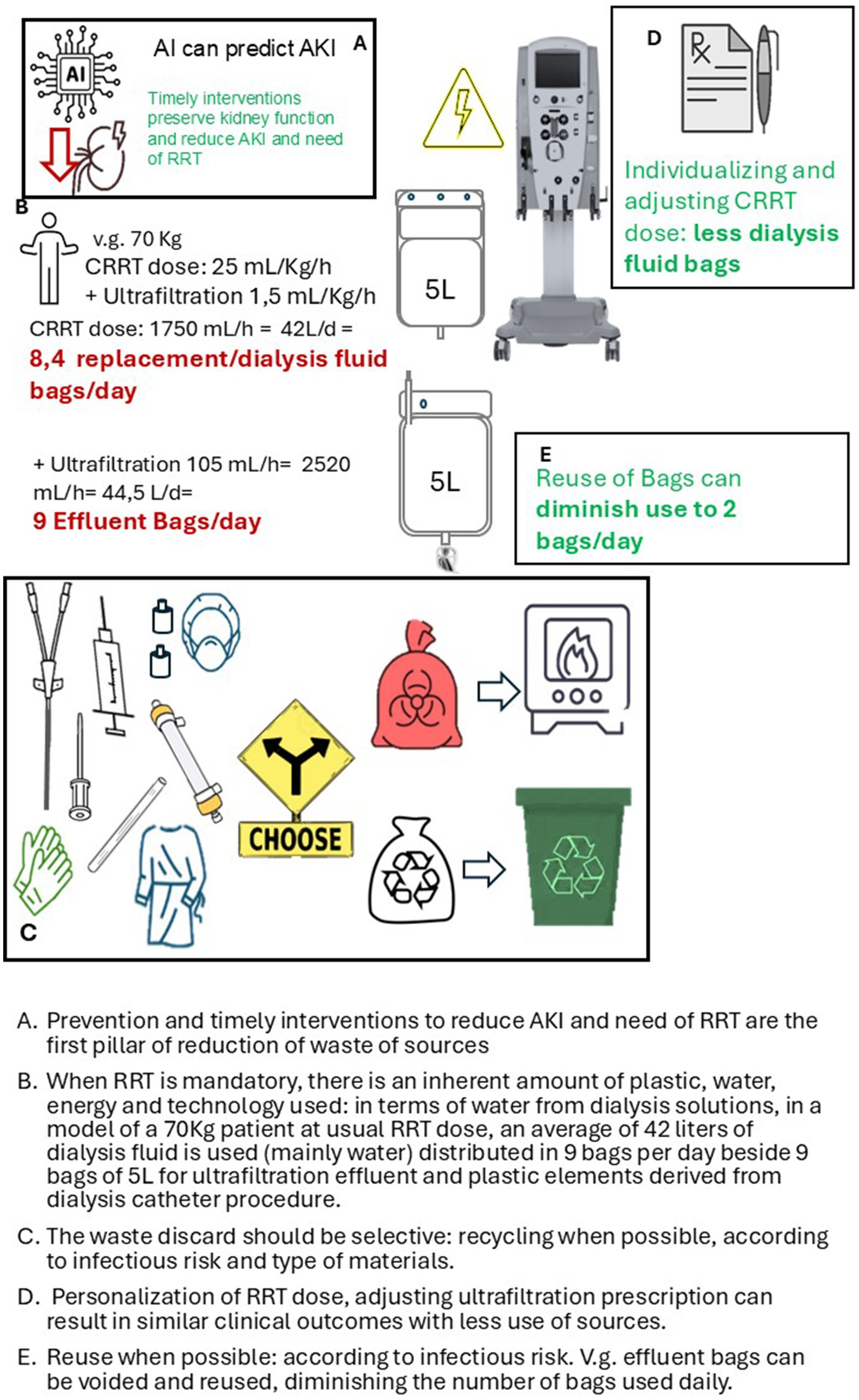 When AKI is already severe and requires RRT, dynamic adjustment of CRRT and IHD doses, based on evolving patient needs (vg adjusting doses, dialysate fluid rate, time of therapy). Personalization of RRT reduces volume of replacement fluid use and associated waste (water, plastic bags, carbon footprint of transportation of fluids, etc) without compromising care quality (8, 11, 22).