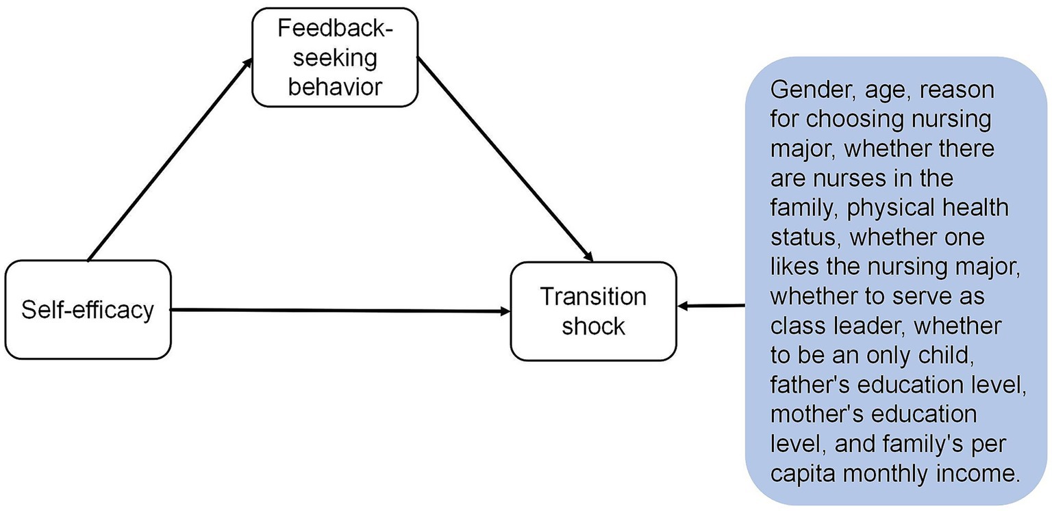 In summary, the factors influencing transition shock are multi-faceted. Most existing research has primarily examined the direct relationships between self-efficacy and transition shock, as well as feedback-seeking behavior and transition shock, with a predominant focus on newly graduated nurses. However, the interplay between self-efficacy and feedback-seeking behavior among nursing interns, and whether feedback-seeking behavior mediates the relationship between self-efficacy and transition shock, warrant further investigation. Therefore, this study specifically targeted nursing interns with the following objectives: (1) to assess the current prevalence of transition shock among nursing interns, and (2) to explore the mediating role of feedback-seeking behavior in the relationship between self-efficacy and transition shock. We hypothesize that: (1) transition shock is negatively correlated with both self-efficacy and feedback-seeking behaviors; and (2) feedback-seeking behavior mediates the relationship between self-efficacy and transition shock among nursing interns (see Figure 1).