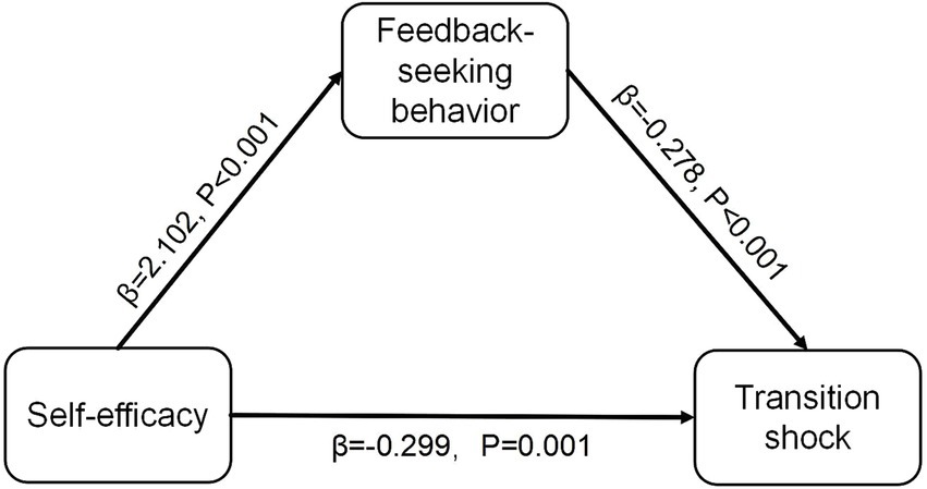 On the other hand, the feedback-seeking behavior has a mediating effect between self-efficacy and transition shock. The mediating effect accounts for 66.1% of the total effect of self-efficacy on transition shock. That is, self-efficacy not only affects the transition shock of nursing students, but also indirectly influences their transition shock through feedback-seeking behavior.
