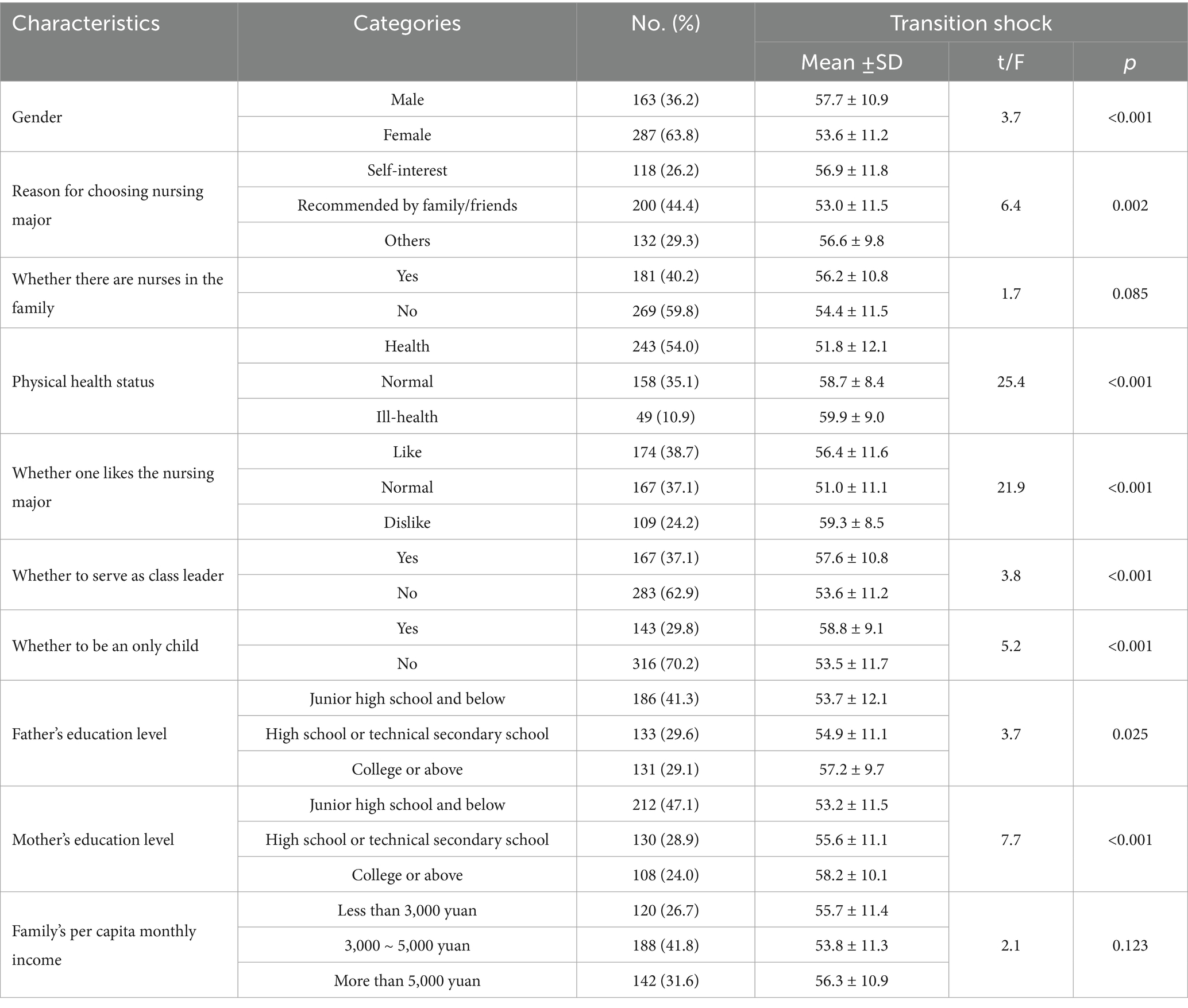 Furthermore, the findings of this study reveal that gender, reason for choosing nursing major, physical health status, whether one likes the nursing major, whether to serve as class leader, and whether to be an only child, as well as parents’ education level, are all factors influencing the transition shock of nursing interns.
