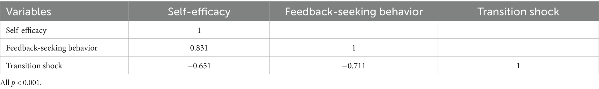 The lower levels of self-efficacy (r = −0.651, p < 0.001) and feedback-seeking behavior (r = −0.711, p < 0.001) were associated with higher levels of transition shock (see Table 2).