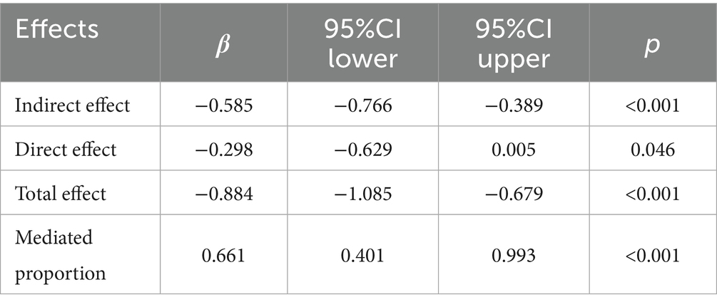 Tables 3, 4 present the mediating effect of feedback-seeking behavior on the relationship between self-efficacy and transition shock, after adjusting for covariates. The model results are illustrated in Figure 2. Overall, self-efficacy has a significant negative impact on transition shock (β = −0.884, p < 0.001). Specifically, self-efficacy demonstrates a significant direct effect on transition shock (β = −0.299, p = 0.001), indicating that higher self-efficacy scores correlate with lower transition shock scores. Furthermore, self-efficacy positively influences feedback-seeking behavior (β = 2.102, p < 0.001), while feedback-seeking behavior exerts a negative influence on transition shock (β = −0.278, p < 0.001). Notably, feedback-seeking behavior partially mediates the relationship between self-efficacy and transition shock, with an indirect effect of −0.585 (95% CI: −0.766 to −0.389, p < 0.001), accounting for 66.1% of the total effect.