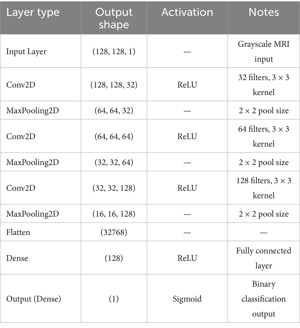 The model processes grayscale MRI images resized to 128 × 128 × 1. The first convolutional layer applies 32 filters (3 × 3) with ReLU activation, followed by a 2 × 2 max-pooling operation. The second convolutional layer utilizes 64 filters (3 × 3) with ReLU activation and an additional 2 × 2 max-pooling operation. The third convolutional layer consists of 128 filters (3 × 3), followed by another pooling operation. The output of the convolutional stages is flattened and passed to a dense layer with 128 neurons, also using ReLU activation. Ultimately, a single output neuron with sigmoid activation yields a binary classification decision (tumor-positive or tumor-negative).