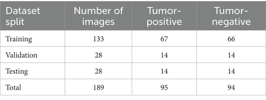 Table 2. Dataset distribution across training, validation, and testing subsets, showing balanced representation of tumor-positive and tumor-negative MRI scans of the first dataset.