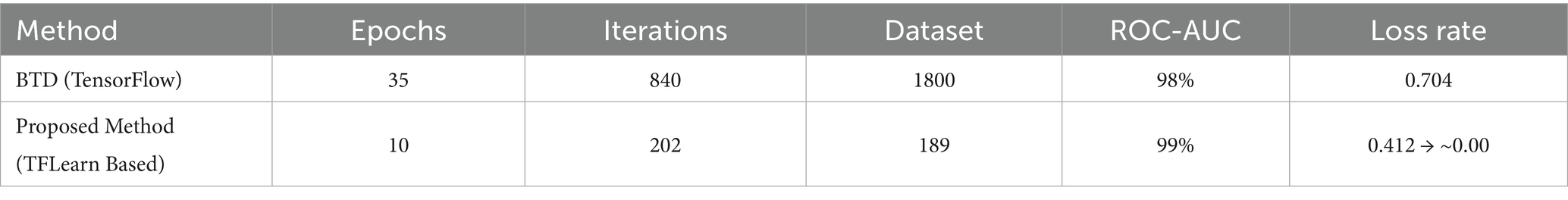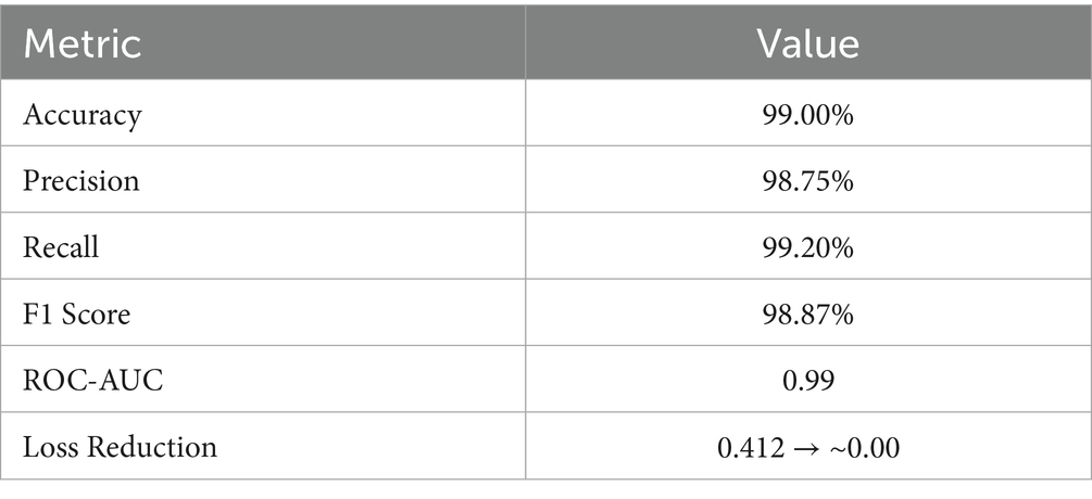 Results: The proposed model achieved 99% accuracy in both training and validation. Key performance metrics, including precision (98.75%), recall (99.20%), F1-score (98.87%), and ROC-AUC (0.99), affirmed the model’s reliability. The loss decreased from 0.412 to near zero. A comparative analysis with a baseline TensorFlow model trained on 1,800 images showed the superior performance of the proposed model.