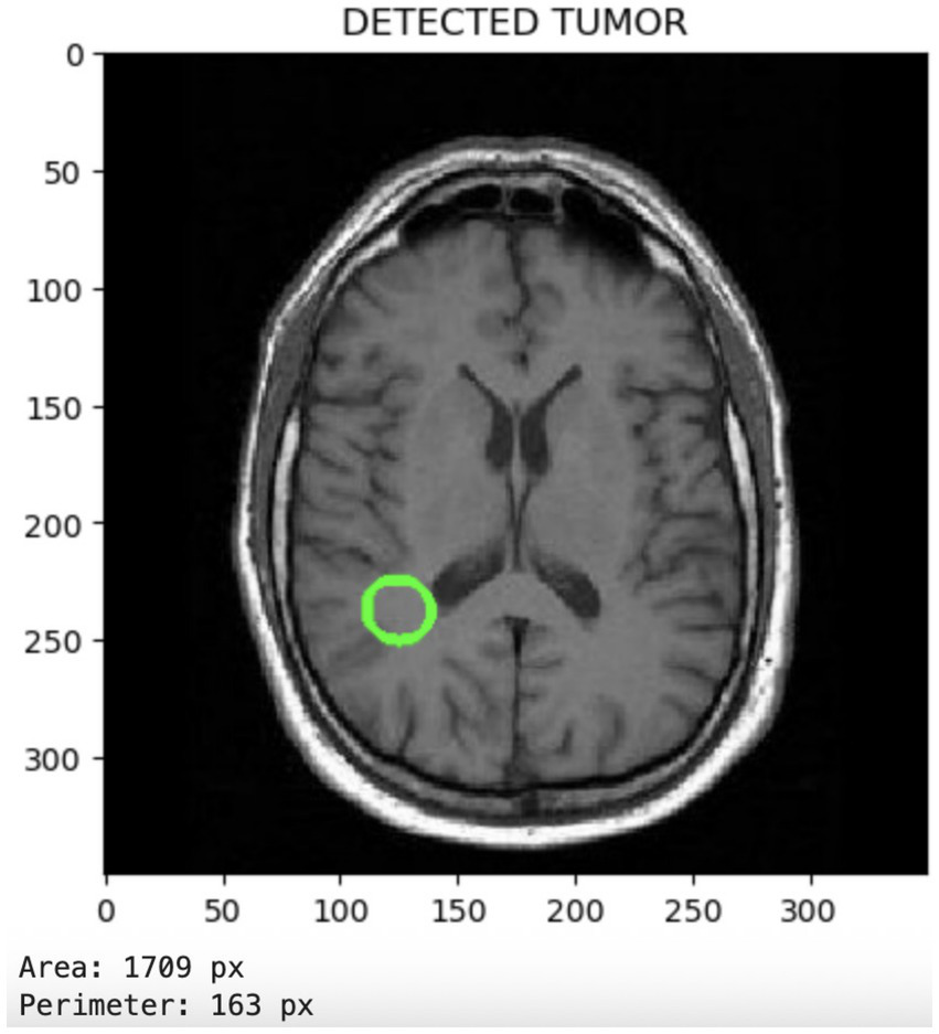 Figure 6 displays the tumor segmentation output, highlighting spatial tumor regions. The trained model not only classifies the presence of tumors but also enables the visualization of the detected tumor region. This segmentation capability adds clinical value by providing spatial context for the tumor’s location and size.