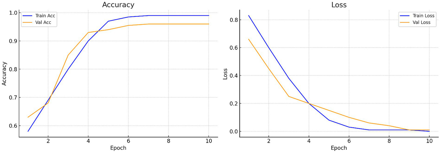 Accuracy and loss curves of the proposed model: Training loss progression illustrating reduction from 0.412 to near zero, reflecting stable model convergence.