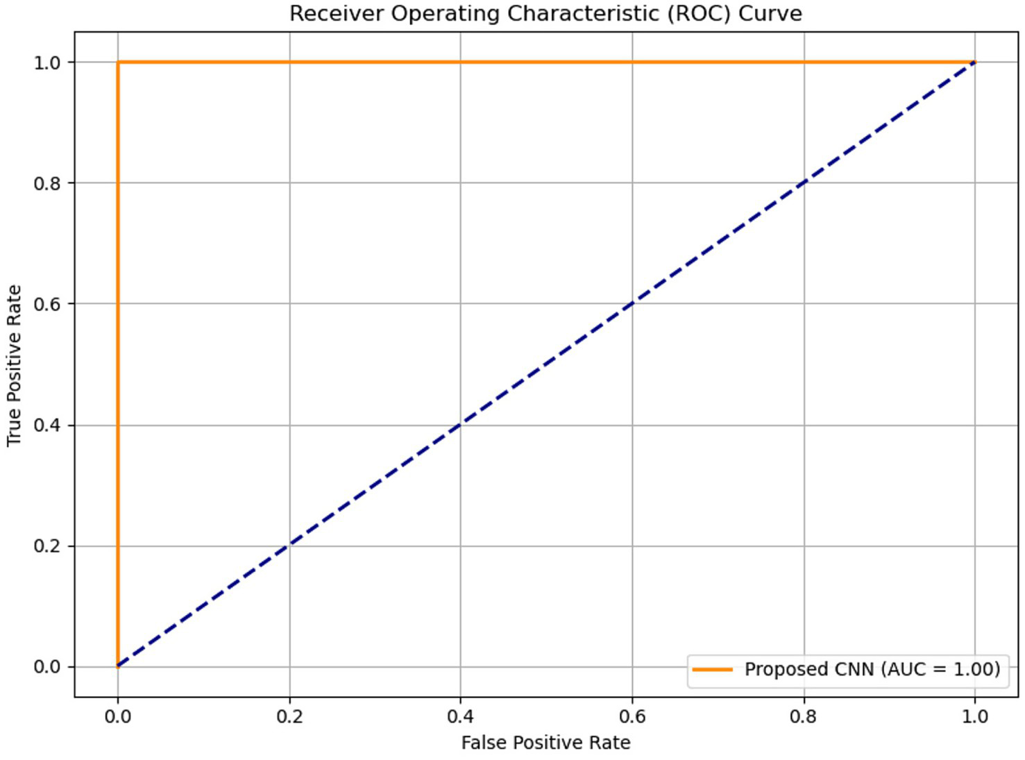 Figure 7 illustrates the accuracy across iterations, which initially shows an uneven distribution but ultimately converges to zero as the iterations progress. The loss rate is a critical component of CNN and is used to improve the CNN architecture. Despite the limited dataset, the proposed model effectively minimizes loss and enhances accuracy. Figure 8 presents the Receiver Operating Characteristic (ROC) curve with an AUC of 0.99, illustrating excellent diagnostic ability.