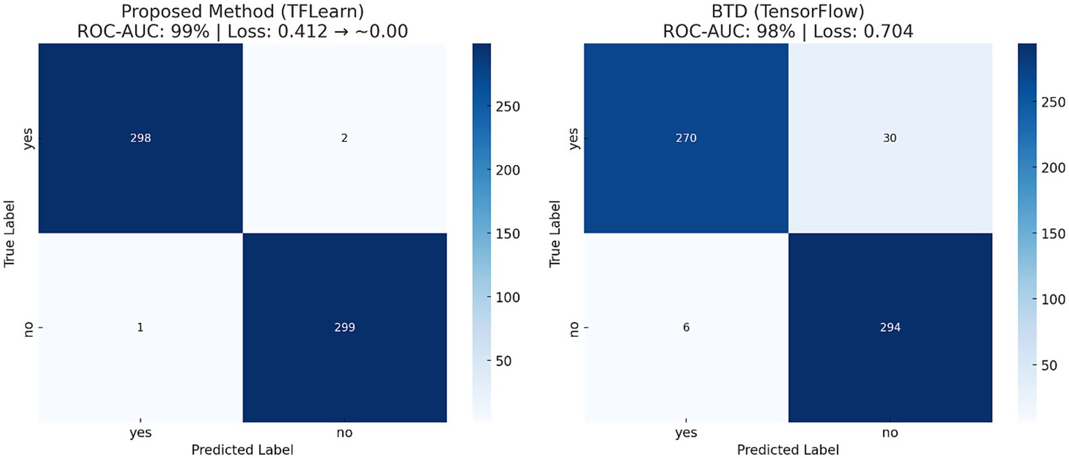 To further assess the performance of the proposed CNN-based model, standard classification metrics were computed, including precision, recall, F1-score, accuracy, and the area under the ROC-AUC curve. Table 3 consolidates critical performance metrics, including training accuracy (99%), validation accuracy (99%), loss rate reduction from 0.412 to nearly zero, precision, recall, F1-score, and ROC-AUC (0.99), providing a clear and concise overview of the model’s effectiveness. Figure 9 illustrates the confusion matrix of both proposed and baseline models when tested with 600 test images of the second dataset. Additionally, Table 4 compares the performance of the proposed model with a baseline TensorFlow model trained on a larger dataset (1800 images) that has lower accuracy (98%) and higher loss (0.704). The proposed CNN model has superior performance despite the limited data.