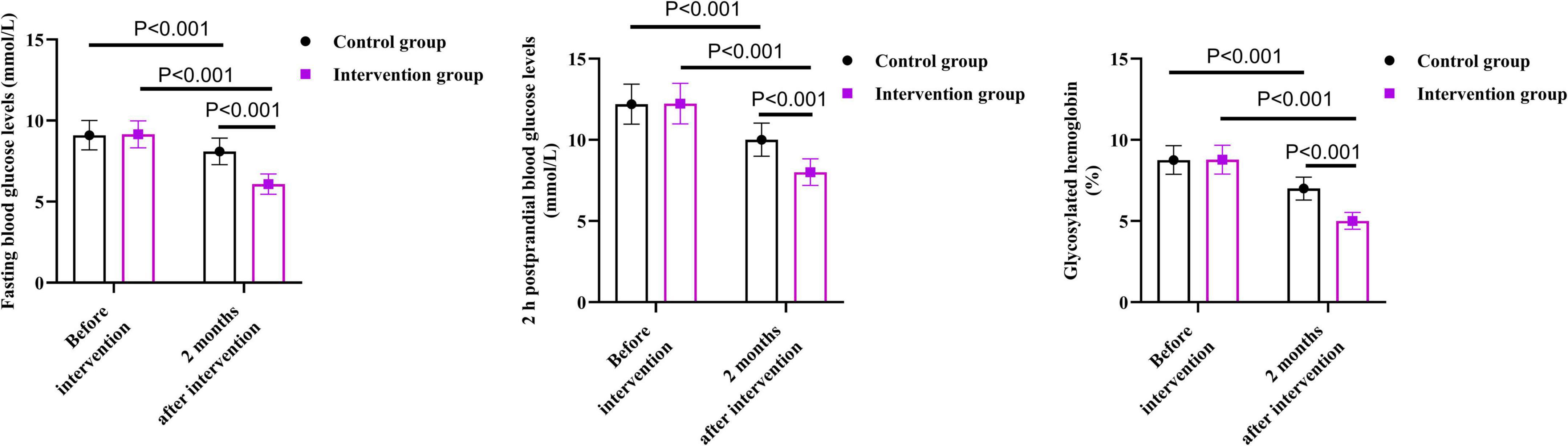 Compared with the control group, the intervention group had lower fasting blood glucose levels, 2 h postprandial blood glucose levels, and glycosylated hemoglobin 2 months after the intervention. Specifically, the fasting blood glucose levels of the intervention group were 1.93 mmol/L lower than those of the control group (P < 0.001); the 2 h postprandial blood glucose levels were 2.00 mmol/L lower than those of the control group (P < 0.001); the glycosylated hemoglobin was 1.99% lower than that of the control group (P < 0.001).