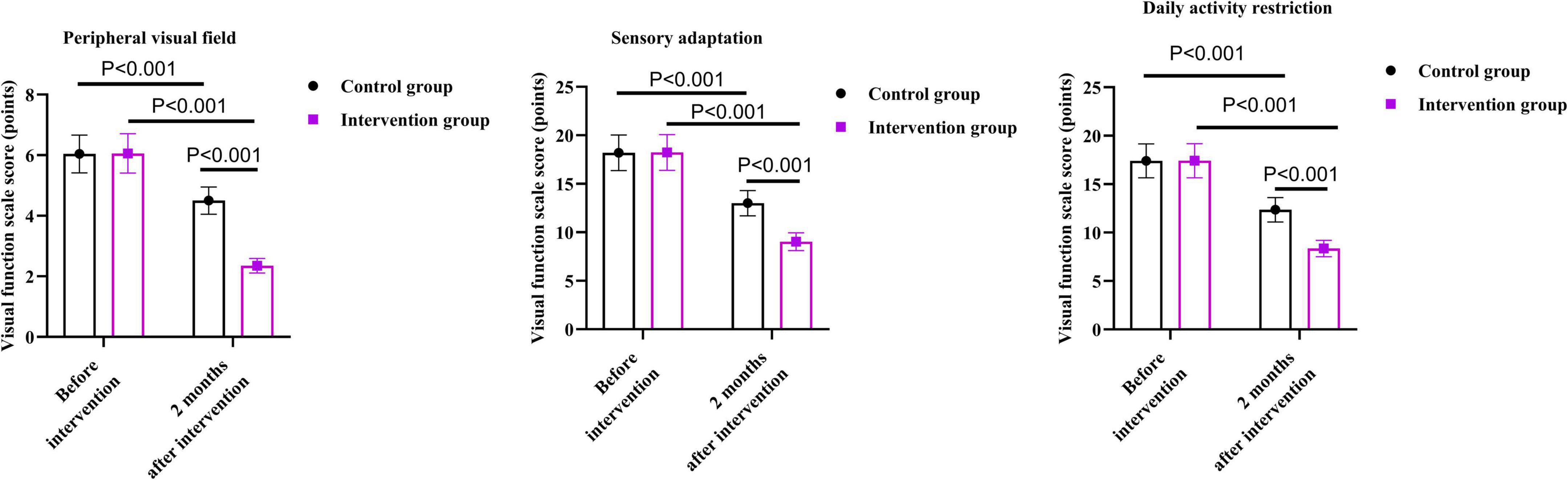 Compared with the control group, the intervention group had lower scores on the visual function scale in terms of peripheral vision, sensory adaptation, and daily activity restriction 2 months after the intervention. Specifically, the peripheral vision score of the intervention group was 2.15 points lower than that of the control group (P < 0.001); the sensory adaptation score was 3.97 points lower than that of the control group (P < 0.001); the score of daily activity restriction was 4.00 points lower than that of the control group (P < 0.001).