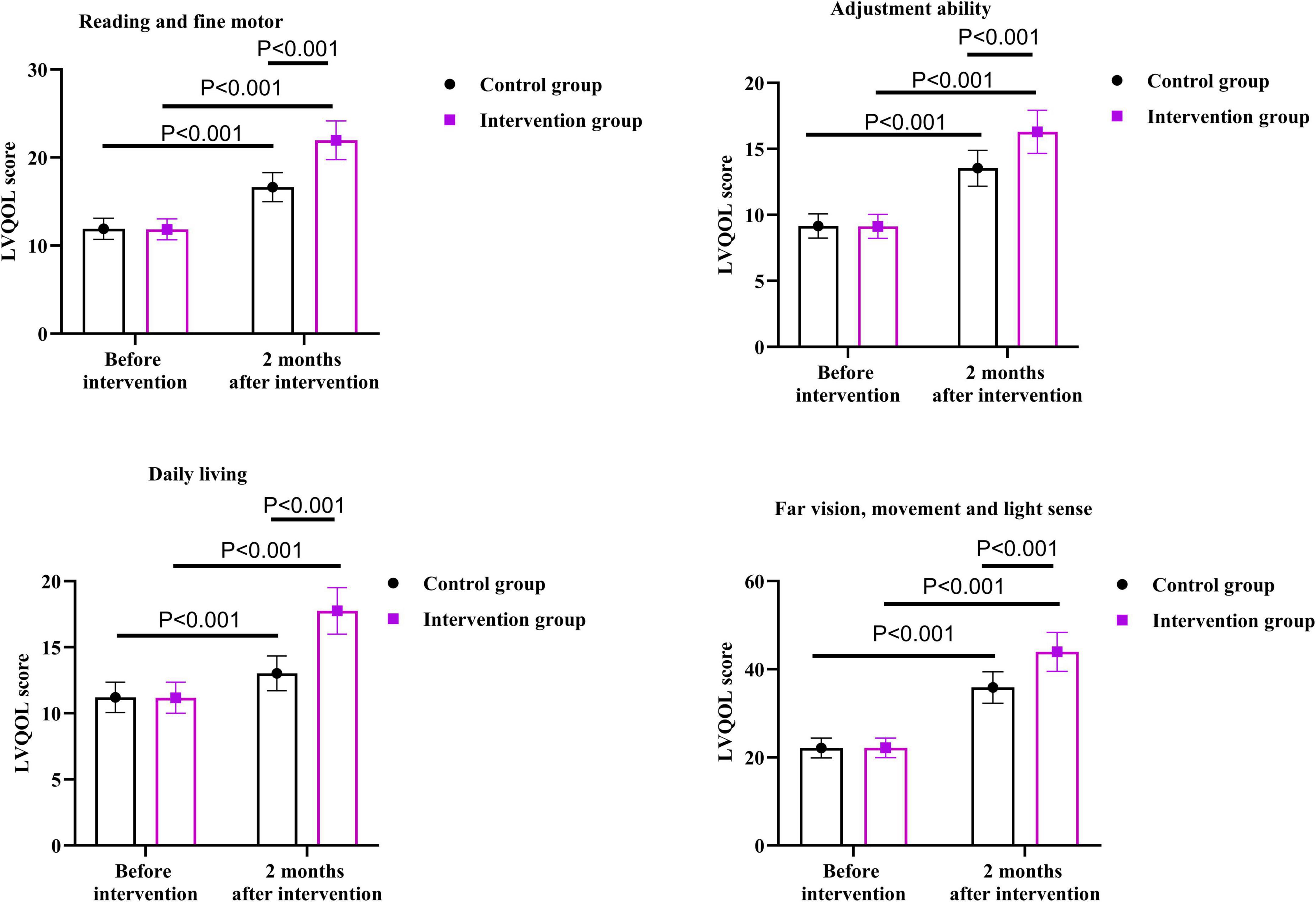 Compared with the control group, the intervention group had higher scores on the higher LVQOL scores in the aspects of reading and fine motor, adjustment ability, daily living, and far vision, movement and light sense 2 months after the intervention. Specifically, the reading and fine motor score of the intervention group was 5.33 points higher than that of the control group (P < 0.001); the adjustment ability score was 2.75 points higher than that of the control group (P < 0.001); the daily living score was 4.73 points higher than that of the control group (P < 0.001); the far vision, movement and light sense score was 8.10 points higher than that of the control group (P < 0.001).