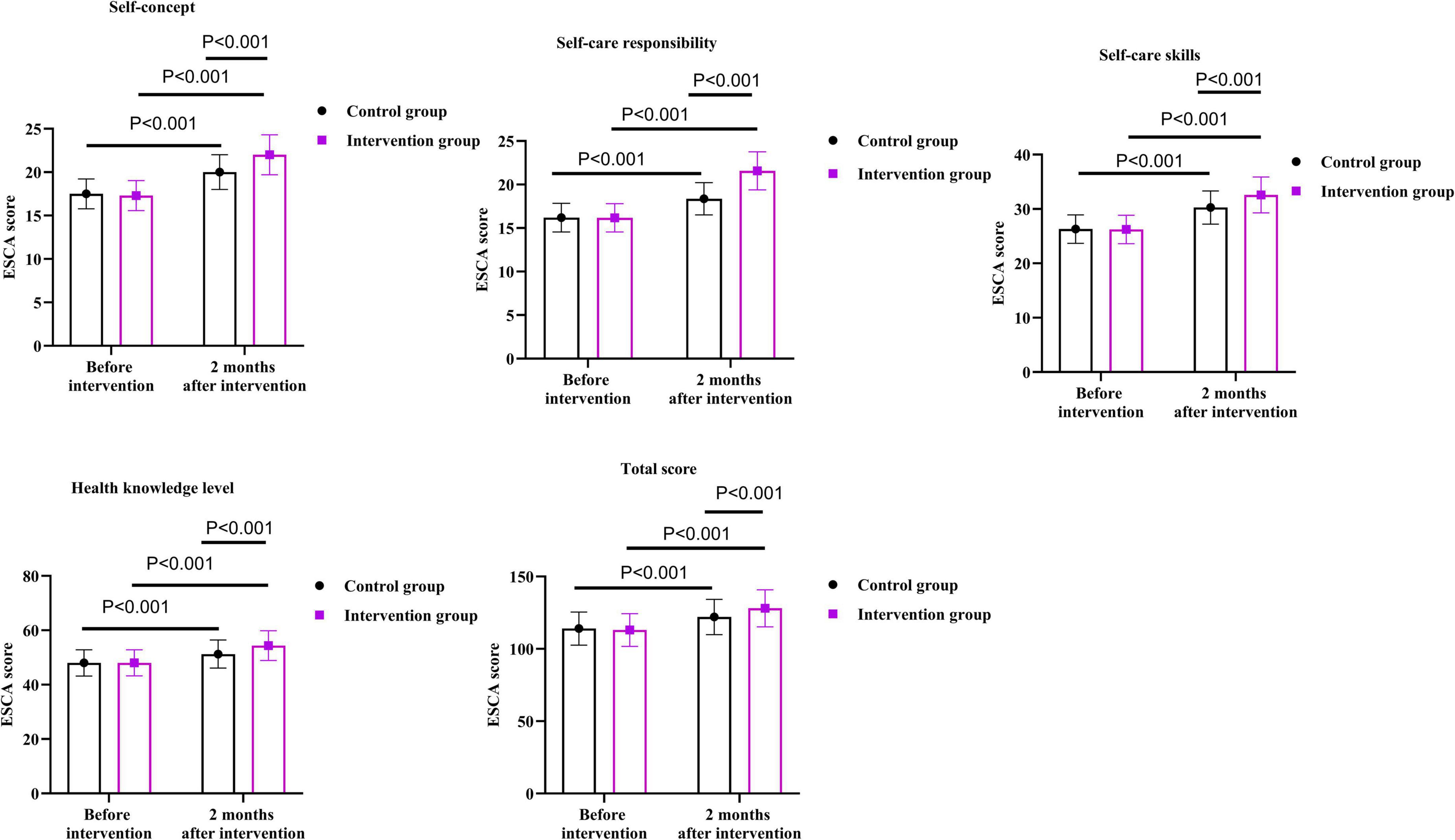 Compared with the control group, the intervention group had higher scores on the ESCA scores of the two groups in the aspects of self-concept, self-care responsibility, self-care ability, health knowledge level and total score 2 months after the intervention. Specifically, the self-concept score of the intervention group was 2.00 points higher than that of the control group (P < 0.001); the self-care responsibility score of the intervention group was 3.22 points higher than that of the control group (P < 0.001); the self-care ability score was 2.30 points higher than that of the control group (P < 0.001); the health knowledge level score was 3.10 points higher than that of the control group (P < 0.001); the total score was 6.00 points higher than that of the control group (P < 0.001).