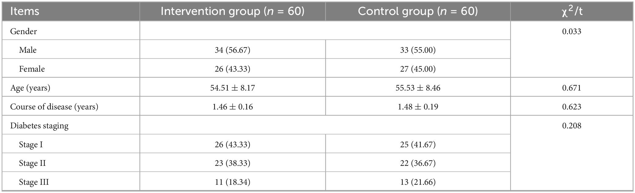 The intervention group contained 34 males and 26 females, ranging in age from 41 to 70 years, with an average age of (54.51 ± 8.17) years. The control group contained 33 males and 27 females, ranging in age from 42 to 71 years, with an average age of (55.53 ± 8.46) years. There were no differences in the basic characteristics of patients such as gender, age, course of disease and diabetes staging between the two groups (P > 0.05) (Table 1).