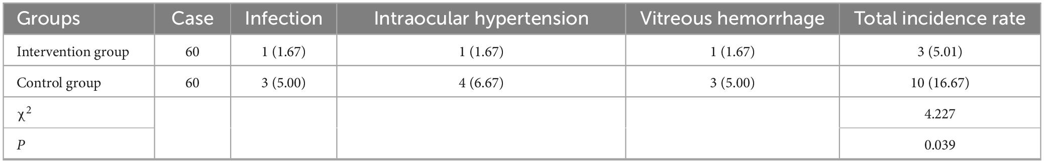 The results of our study also demonstrated that the incidence of adverse events in the intervention group was lower than that in the control group, suggesting that the nursing intervention based on TPB could improve the safety of the surgery by closely cooperating with the doctors during the operation and making adequate preparations before the surgery, thereby reducing the stress response of the patients. At the same time, postoperative eye care, exercise and diet guidance were provided according to specific circumstances, enabling patients to maintain a healthier lifestyle, thus effectively avoiding adverse risks. By providing postoperative follow-up guidance on how to perform self-care, nurses could enhance patients’ self-care abilities and achieve the goal of preventing adverse event.