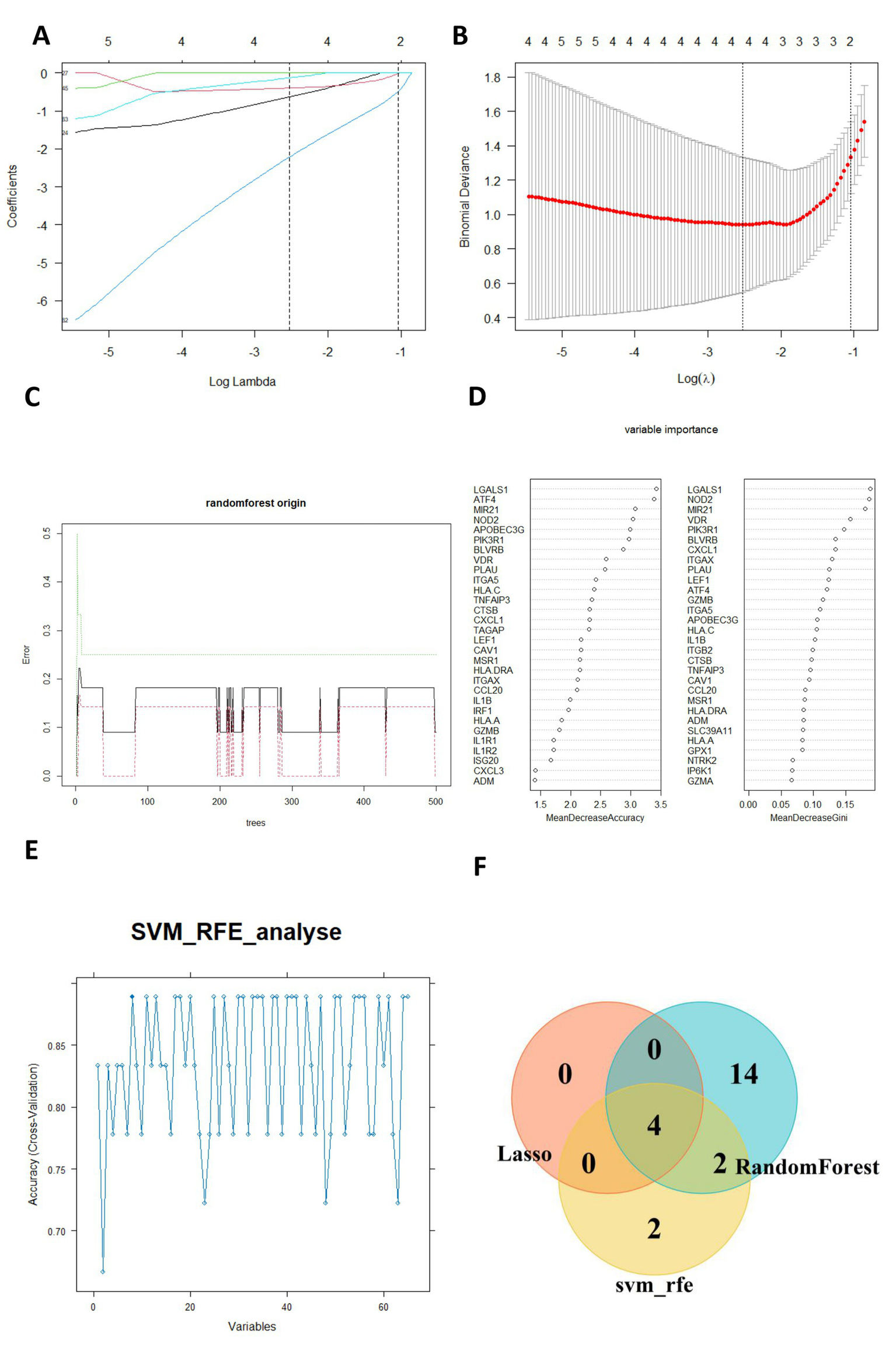 Selection of hub genes by machine learning algorithms. (A) Ten cross-validations of adjusted parameter selection in the LASSO model. (B) LASSO coefficient analysis. Vertical dashed lines are plottedat the best lambda. (C) Relationship between the number of randomforest trees and error rates. (D) The importance of GMRDEGs were ranked by MeanDecreaseaccuracy and MeanDecreaseGini. (E) SVM-RFE was applied for characteristic gene selection. (F) The venn diagram showed the common hub genes selected by the three algorithms.
