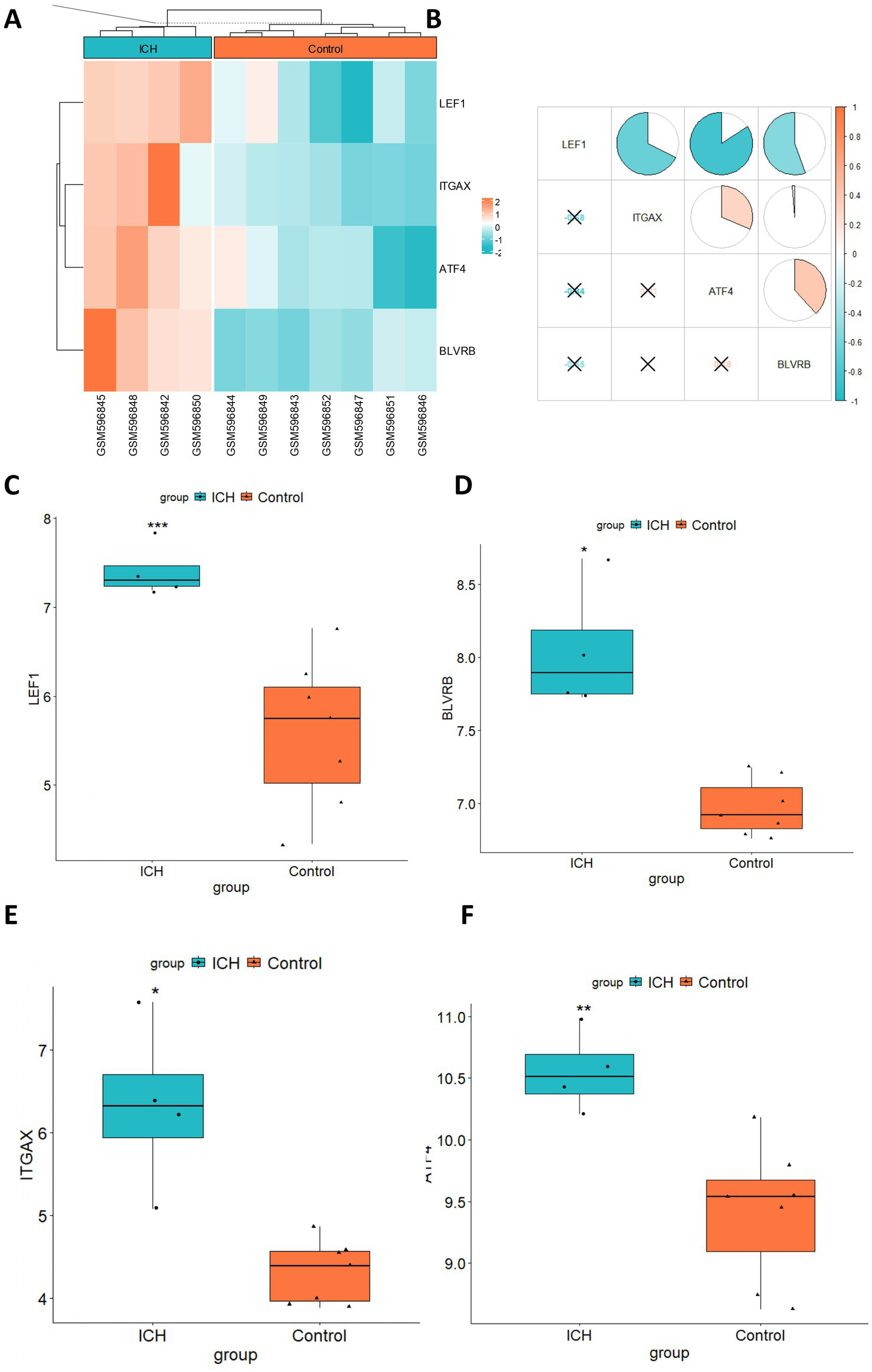 Expression pattern of hub genes in ICH. (A) The heatmap showed the expression profile of 4 hub genes in ICH. (B) The expression correlation between hub genes was evaluated by the Pearson correlation analysis. Box plots showed the expression comparison between the ICH and control group for (C) LEF1, (D) BLVRB, (E) ITGAX, and (F) ATF4. *p < 0.05, **p < 0.01, ***p < 0.001.