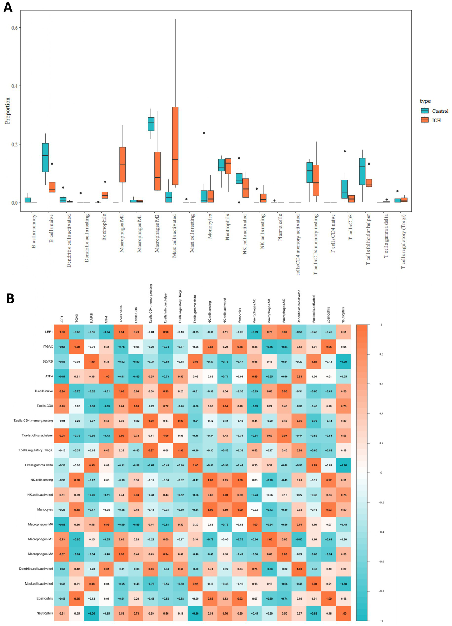 Immune infiltration analysis in ICH. (A) The comparison of proportion of immune cells between ICH and control groups. (B) The heatmap showed the correlation between immune cell infiltration levels and expression hub genes.
