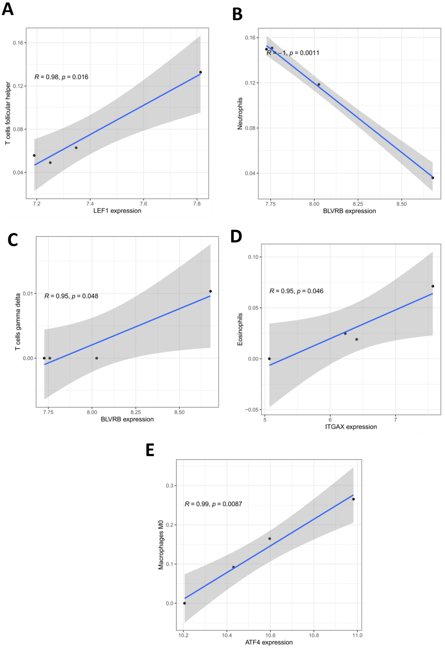 Correlation between hub gene expression and infiltration levels of immune cells. (A) The correlation between LEF1 expression and proportion of T cells follicular helper in ICH group. (B) The correlation between BLVRB expression and proportion of neutrophils in ICH group. (C) The correlation between BLVRB expression and proportion of T cells gamma delta in ICH group. (D) The correlation between ITGAX expression and proportion of Eosinophils in ICH group. (E) The correlation between ATF4 expression and proportion of macrophage M0 in ICH group.