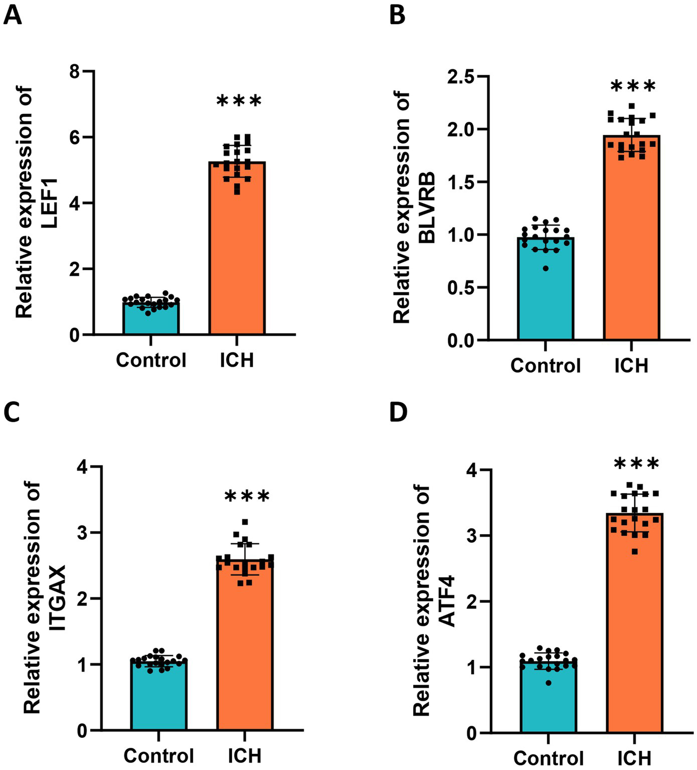 Validation of hub genes in clinical samples. RT-qPCR analysis was performed to detect the expression of (A) LEF1, (B) BLVRB, (C) ITGAX, and (D) ATF4 using RT-qPCR in the blood samples of ICH patients and healthy donors. Measurement data were expressed as mean ± standard deviation. Data comparisons between two groups were performed using t-tests.