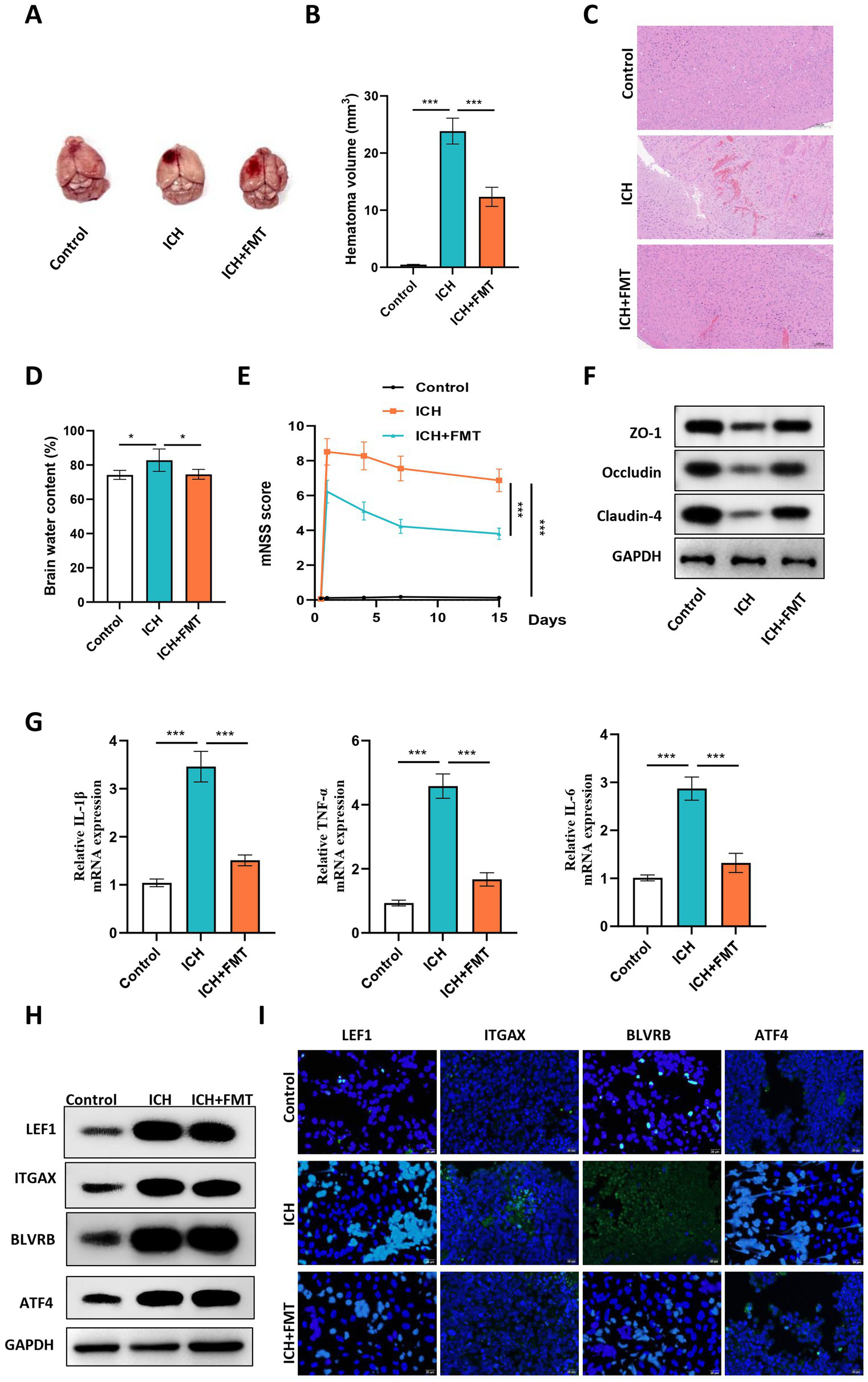 We identified 806 DEGs in ICH, among which 65 overlapped with GMRGs. These GMRDEGs were enriched in immune processes and pathways such as TNF and IL-17 signaling. PPI network analysis highlighted IL1B, IL6, and CCL2 as central nodes. Machine learning identified four hub genes—LEF1, ITGAX, BLVRB, and ATF4. All were significantly upregulated in ICH tissues and plasma, correlating with immune cell infiltration. In vivo, FMT reduced hematoma volume and brain edema, improved neurological function, restored intestinal barrier proteins, decreased inflammatory cytokines, and downregulated hub gene expression.