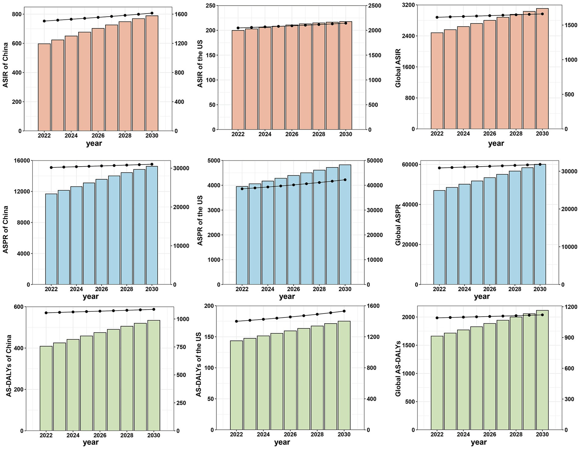 To project the burden of OA in China, the US, and globally, from 2022 to 2030, we employed the BAPC prediction model to estimate ASIR, ASPR, and AS-DALYs in individuals aged 55 and older. Figure 5 presents the model’s projections, with the left y-axis showing the number of cases and the right y-axis displays the ASR data. The projections indicate a persistent rise in OA burden across China, the US, and globally through 2030. While China currently exhibits lower ASIR, ASPR, and AS-DALYs than the US, it demonstrates a higher rate of increase. Taking ASIR as an example, projections indicate that China will experience a substantial increase, from 1,505 in 2022 to 1,614 in 2030 per 100,000 population, representing a growth rate of about 7.2%. In contrast, the US is projected to see a more modest rise from 2048 to 2,143 per 100,000 population, with a growth rate of approximately 4.6%. Globally, ASIR is expected to rise from 1,612 to 1,661 per 100,000 population, reflecting a growth rate of about 3.0%. Projections indicate a persistent increase in the OA burden among individuals aged 55 and older in China, the US, and globally through 2030. While China currently exhibits lower ASIR, ASPR, and AS-DALYs than the US, it demonstrates a higher rate of increase. This faster growth in China suggests that public health interventions and healthcare resources may need to be scaled up more rapidly in China compared to the US to address the future burden of OA effectively.
