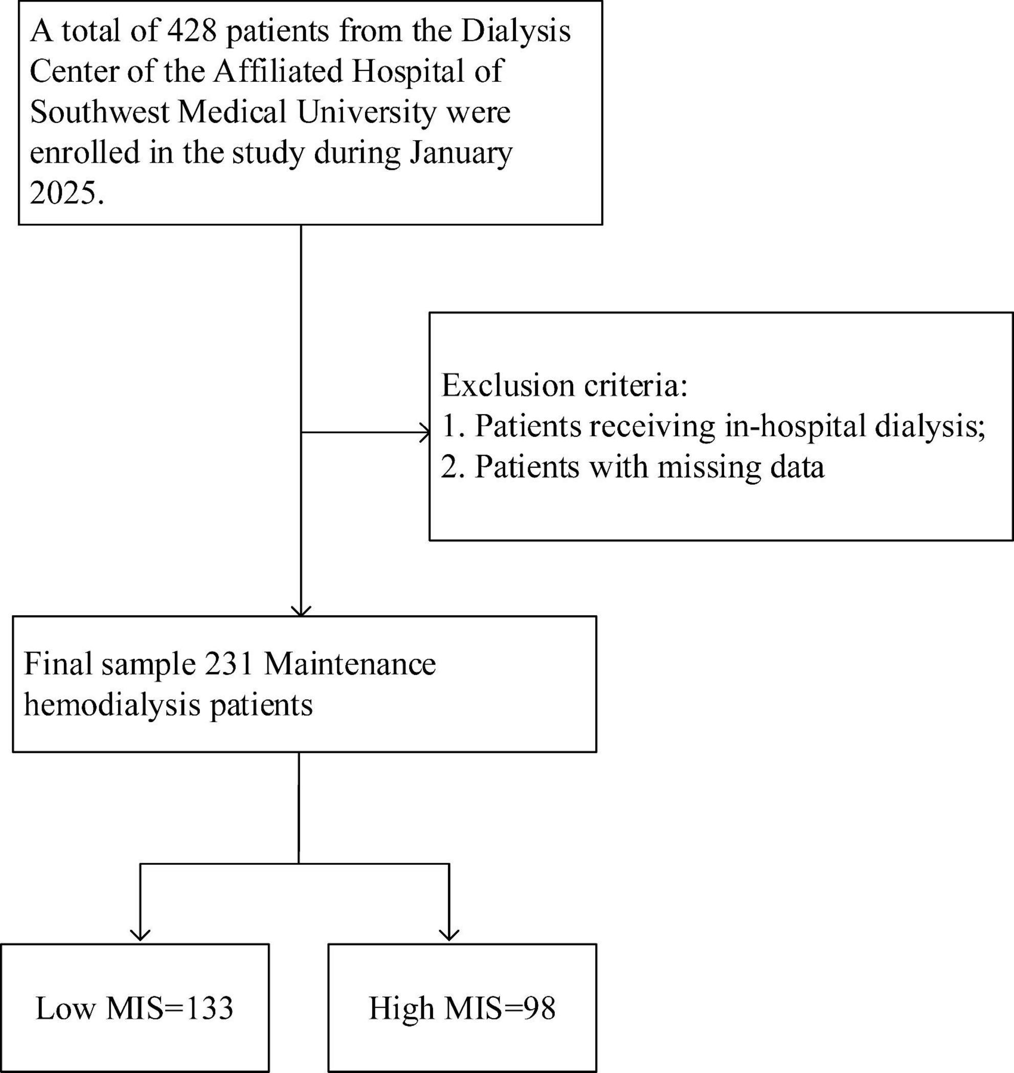 Figure 1. Research flowchart. A total of 428 patients undergoing maintenance hemodialysis (MHD) were initially assessed for eligibility. According to the predefined inclusion and exclusion criteria, 197 patients were excluded, resulting in 231 patients being included in the final analysis. These patients were categorized into a low MIS group (n = 133) and a high MIS group (n = 98) based on a cutoff score of 7. MIS, Malnutrition Inflammation Score.