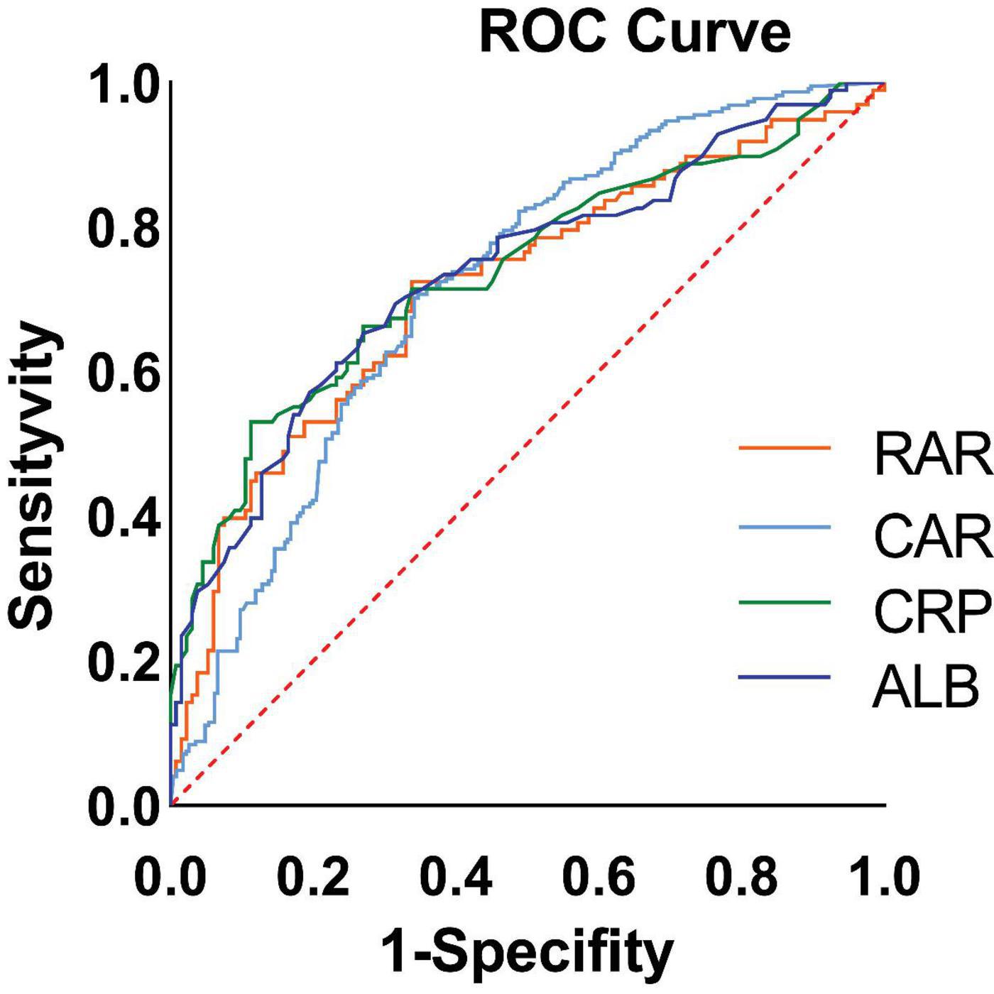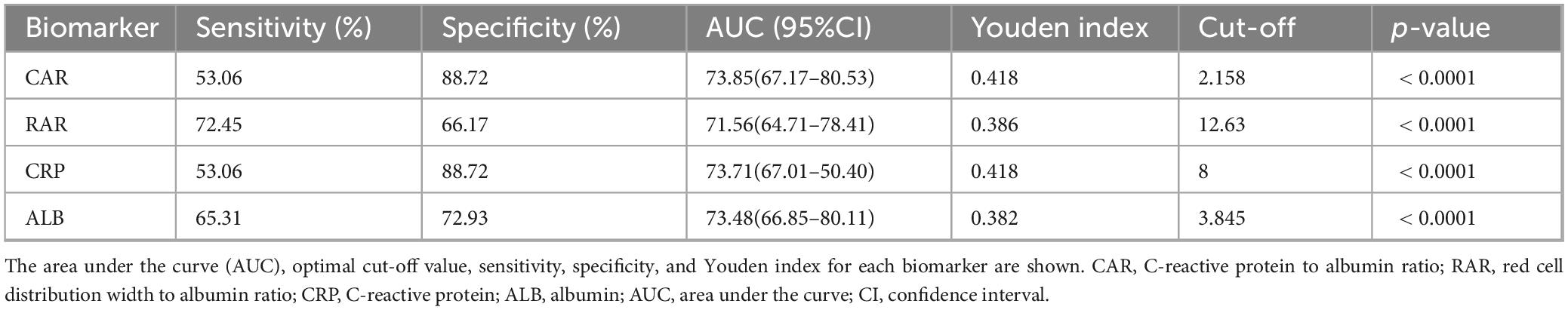 Next, the ROC curves for CAR, RAR, C-reactive protein, and serum albumin were plotted (Figure 2). Their predictive performance is shown in Table 3. The CAR yielded the best predictive performance, with an area under the curve (AUC) of 73.85% (95% CI: 67.17–80.53%), and an optimal cut-off value of 2.158, associated with a sensitivity of 53.06% and a specificity of 88.72%.