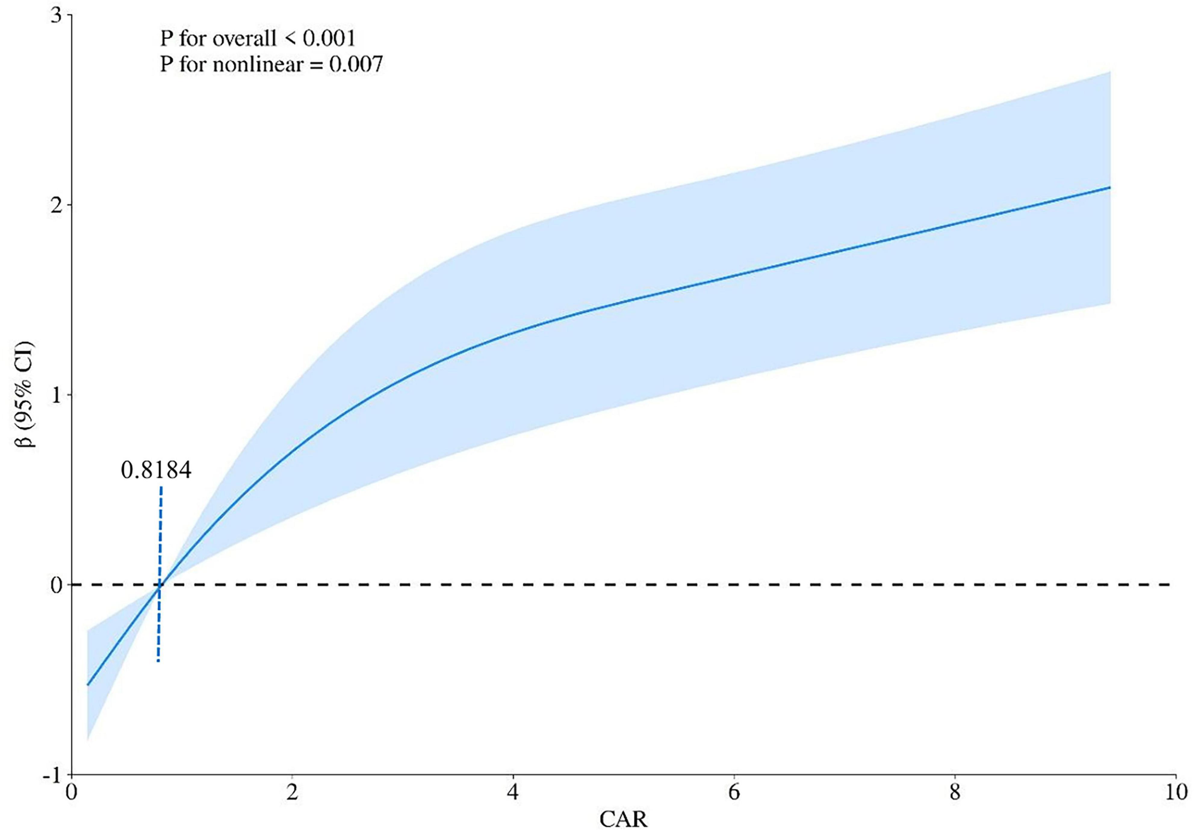 An RCS curve was plotted to clarify the non-linear relationship between MIS and CAR (p = 0.007). The relationship demonstrated an inflection point at a CAR value of 0.8184, with a negative correlation observed below this threshold and a positive correlation above it (Figure 3).