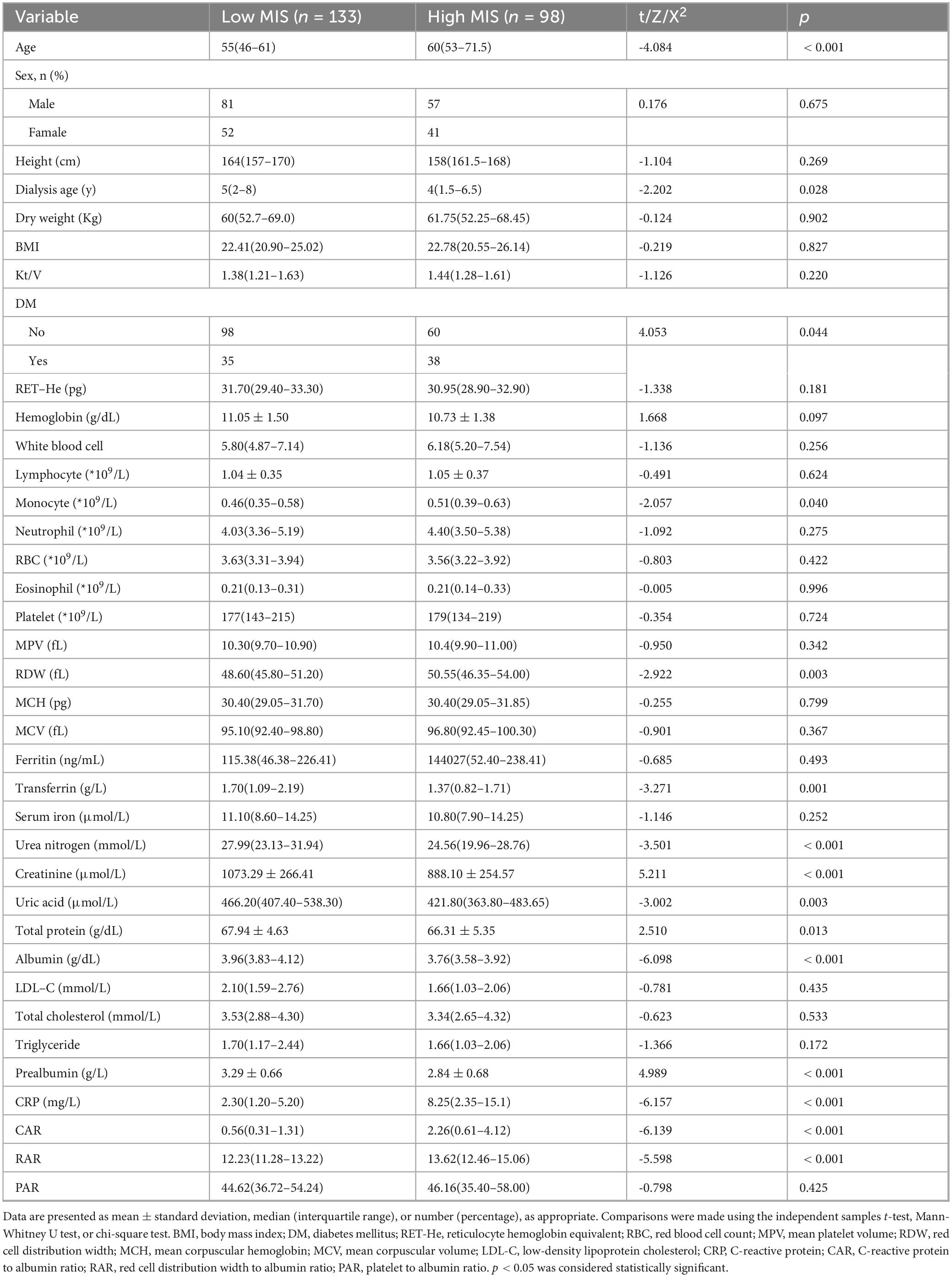 A total of 428 patients undergoing MHD were initially screened. Based on the established inclusion and exclusion criteria, 231 patients were ultimately selected for analysis (Figure 1). Patients were categorized into two groups according to their MIS: a low MIS group (n = 133, 57.6%) and a high MIS group (n = 98, 42.4%). The baseline demographic and clinical characteristics of these groups are detailed in Table 1. Both groups exhibited comparable characteristics in terms of dialysis vintage, dry weight, and BMI (p > 0.05). However, patients in the high MIS score group were significantly older than those in the low MIS score group (p < 0.05). Regarding laboratory indicators, the low MIS score group demonstrated significantly lower levels of white blood cells, monocytes, eosinophils, and CRP compared to the high MIS score group (p < 0.05). Conversely, the levels of transferrin, blood urea nitrogen, creatinine, uric acid, albumin, and prealbumin were significantly higher in the low MIS score group than in the high MIS score group (p < 0.05).