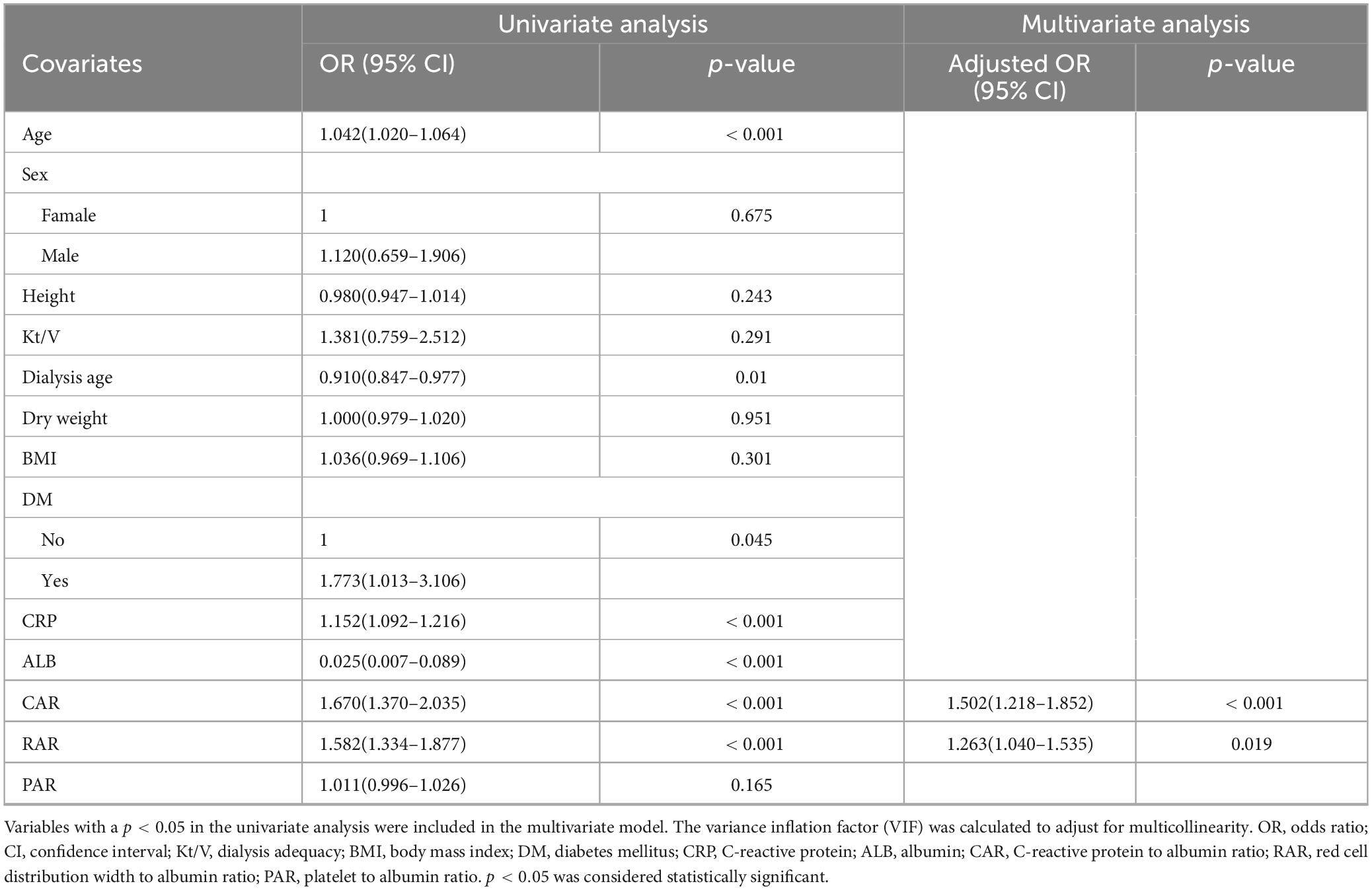 Table 2. Univariate and multivariate logistic regression analyses of factors associated with high malnutrition-inflammation score (MIS) in maintenance hemodialysis patients.