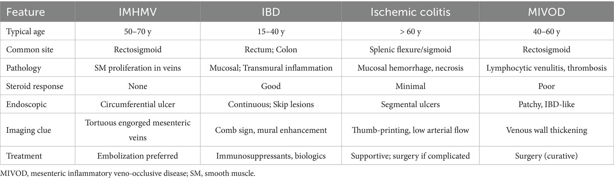 Endoscopic features often include circumferential or longitudinal ulcerations, mucosal fragility, and a cobblestone appearance. Notably, rectal sparing and continuous lesion distribution (without “skip areas”) are distinguishing features from Crohn’s disease. Although endoscopic biopsies are usually insufficient for definitive diagnosis, certain features—such as thickened, arterialized capillaries with sub-endothelial fibrin deposition—may raise suspicion for IMHMV (9). Radiological findings may support this diagnosis as well; segmental bowel wall thickening, mucosal edema, and mesenteric venous abnormalities have been reported in some cases (10).
