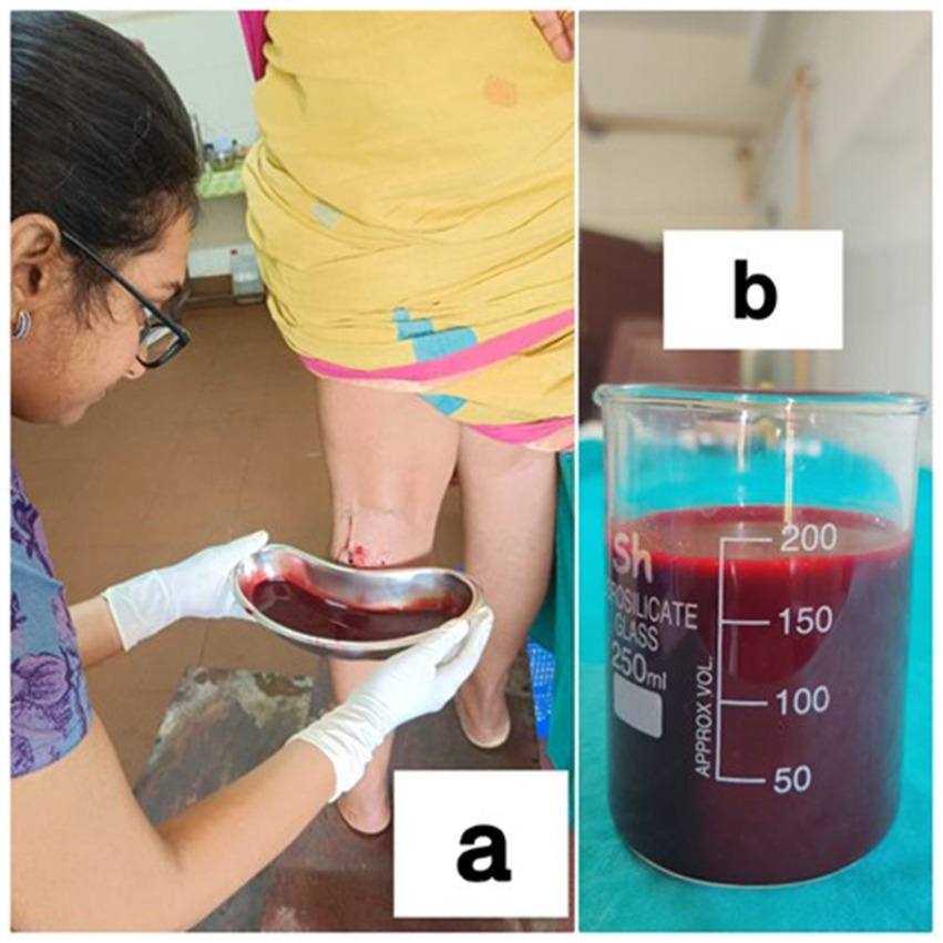 Figure 1. (a) During the procedure in a patient, and (b) blood measured by collecting in a glass beaker.