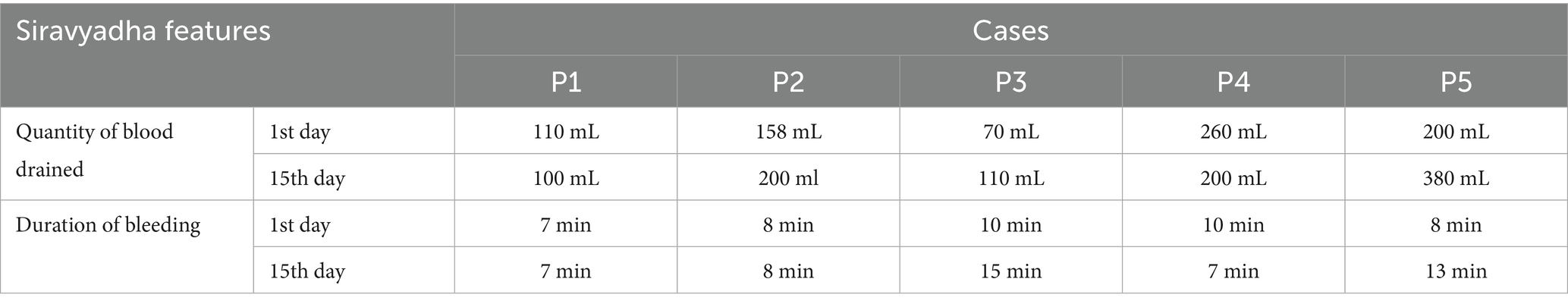 The quantity of blood drained and the duration of bleeding during sirāvyadha on the 1st day and 15th day are represented in Table 1.