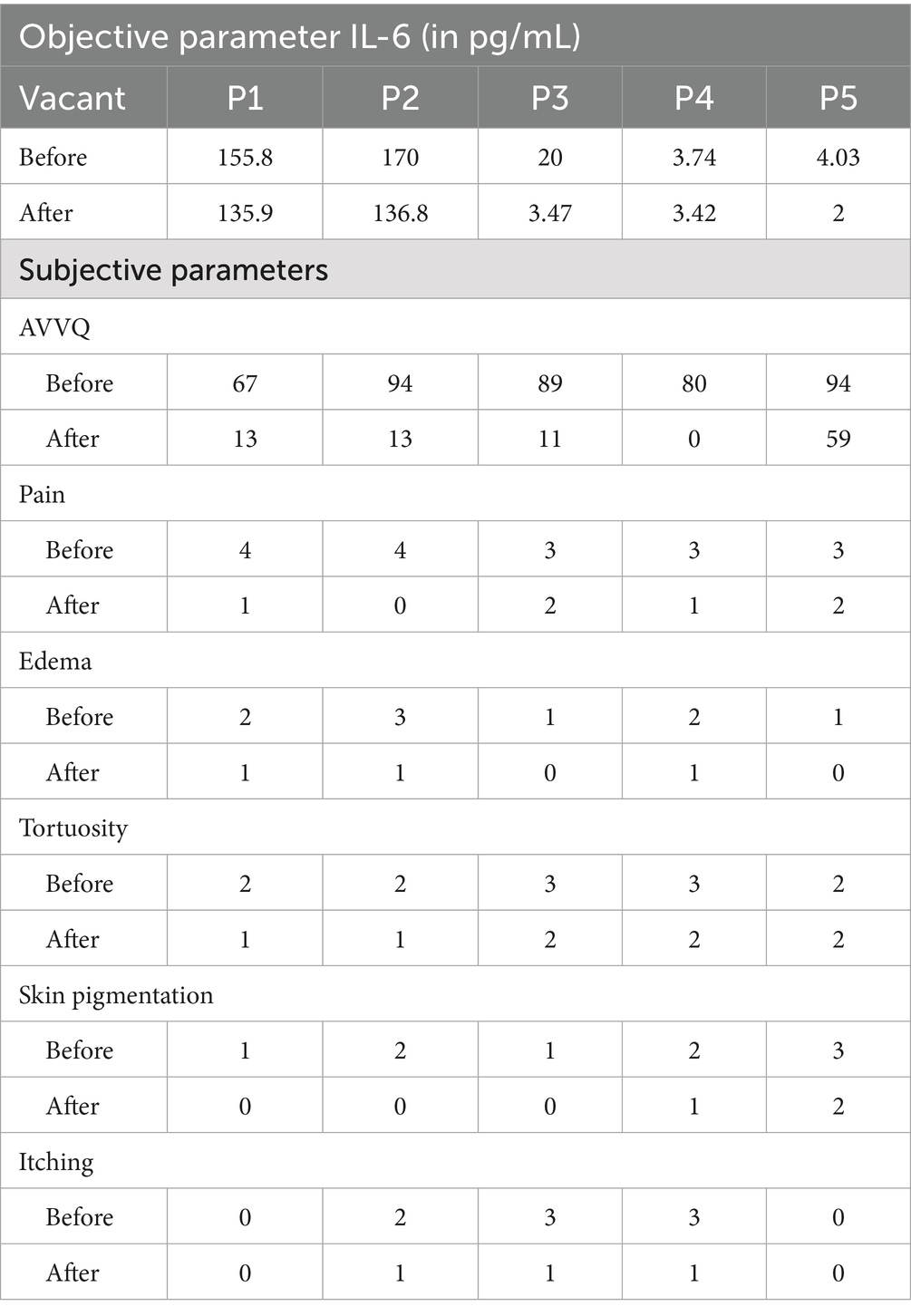Results: Statistically significant differences (p<0.05) were observed after treatment in Interleukin-6, AVVQ, pain, edema, tortuosity, and skin pigmentation. However, itching showed no statistically significant difference after treatment (p > 0.05).