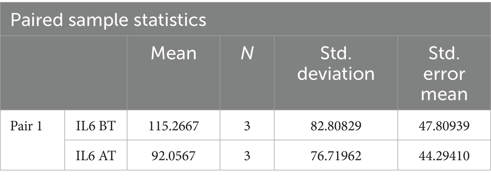 A paired t-test was performed to evaluate the significant difference in the mean value of Interleukin-6 before treatment and after treatment. Among the recruited patients, samples for checking IL-6 were collected from the blood drained during sirāvyadha. The blood sample collected on the 1st day was considered the before value, represented as IL-6 BT, and the sample collected on the 15th day was considered the after value, represented as IL-6 AT. IL-6 was found to be in the normal range in the sample analyzed during the first sitting itself in two patients. In the other three patients, elevated levels of IL-6 were observed in the sample analyzed during the first sitting, suggesting severe inflammation. Only those three patients were included in the statistical analysis. It was observed that there was a significant difference in the mean values before and after treatment in the patients with abnormal IL-6 levels. The mean IL-6 score before treatment was 115.26, which decreased to 92.0 after treatment, as shown in Table 3.