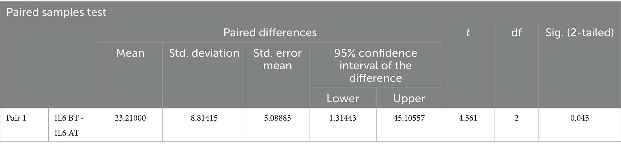 The two-tailed significance value for Interleukin-6 levels before and after treatment was p < 0.05, suggesting a statistically significant difference in IL-6 levels before and after treatment. This is presented in Table 4.