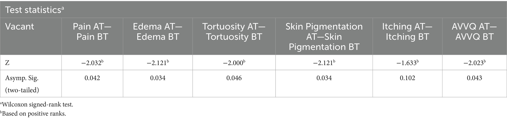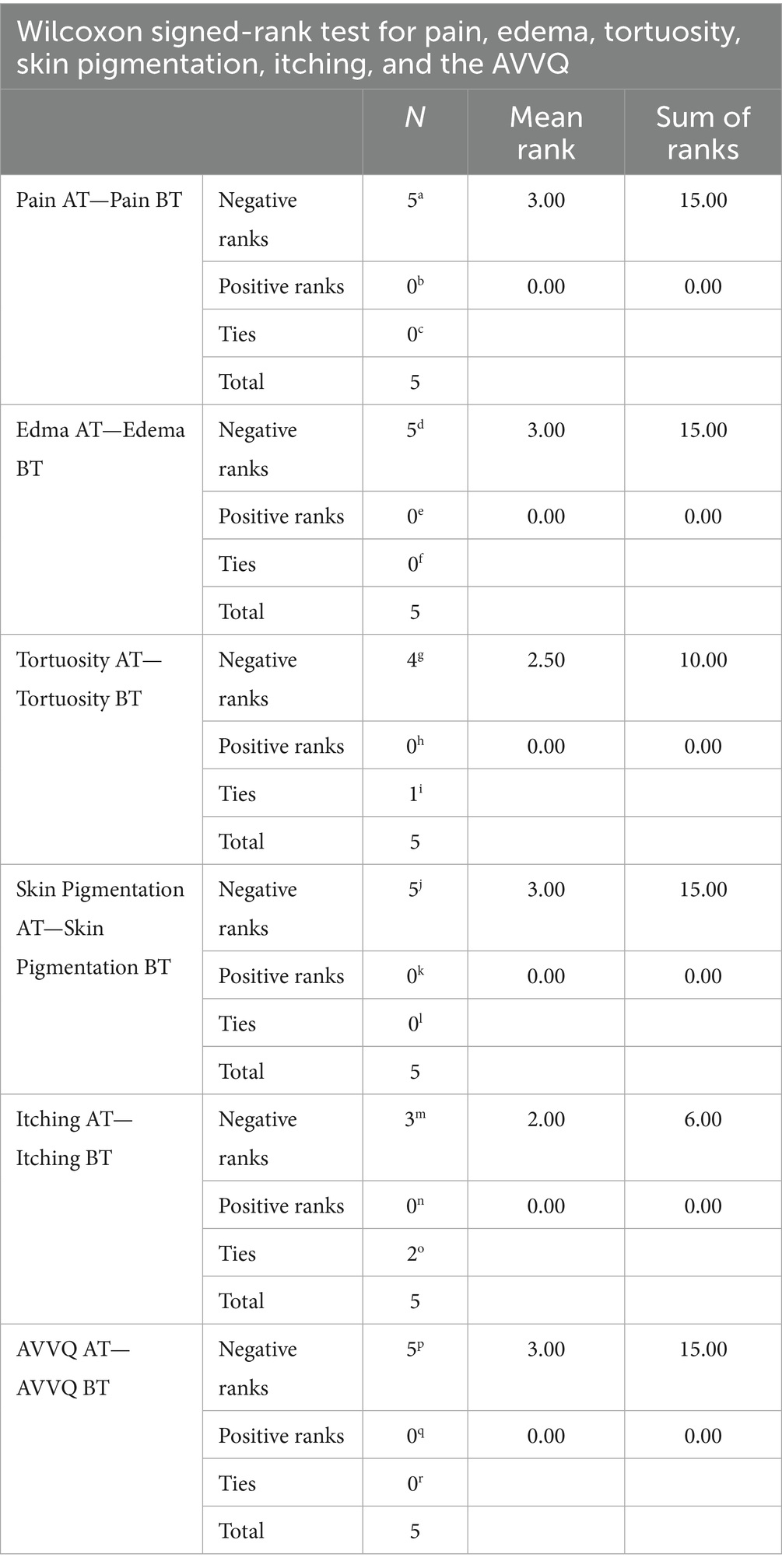 The Wilcoxon signed-rank test revealed a decrease in the mean scores of the VAS (pain), edema, tortuosity, skin pigmentation, itching, and the AVVQ before and after treatment, as shown in Table 5.